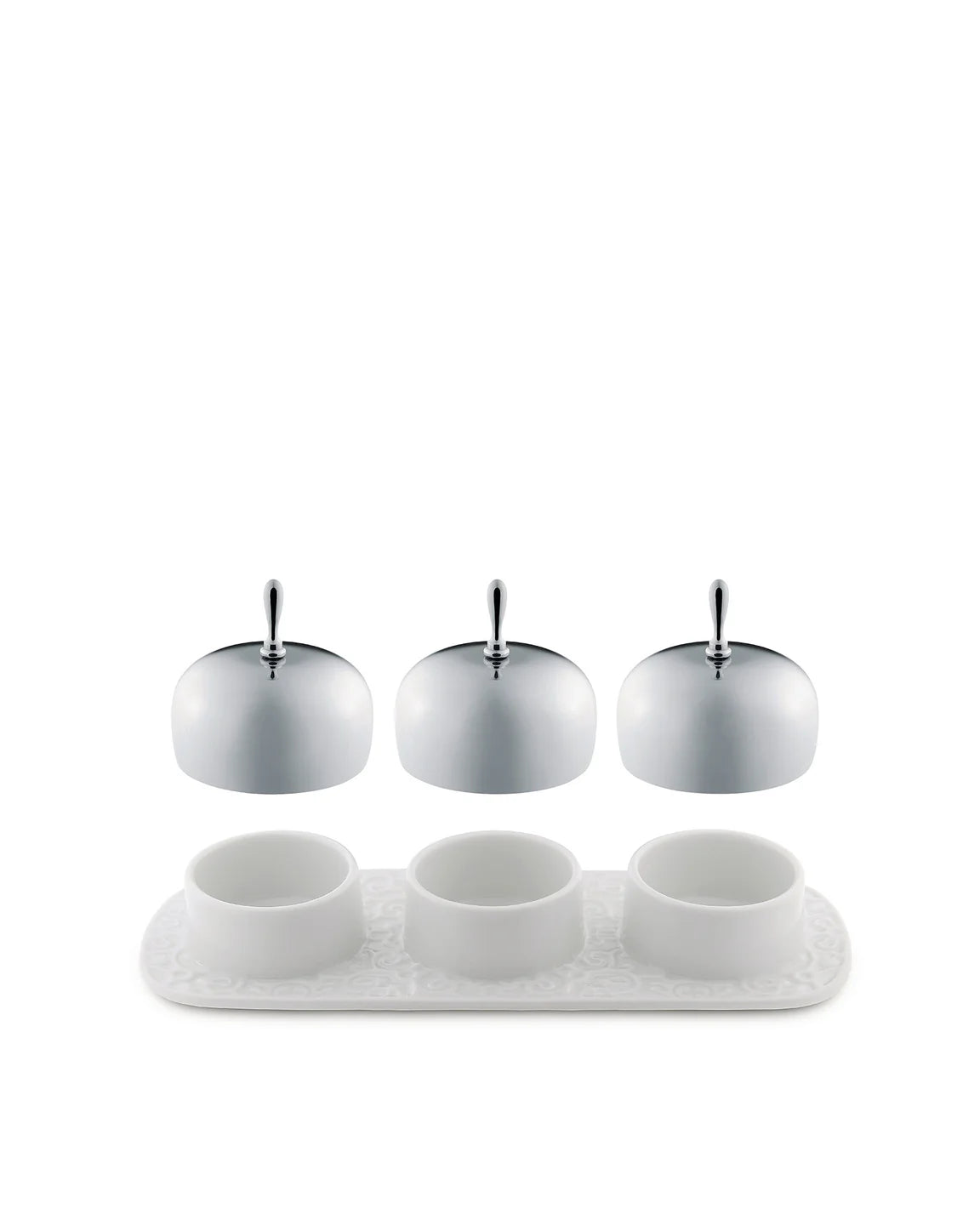 Tassen für Marmelade Kleid aus Porzellan und Edelstahl ist eine elegante Ergänzung zum Frühstückstisch. Ihr Design, das von Marcel Wanders entworfen wurde, kombiniert die Funktionalität mit Ästhetik und bietet eine einfache und subtil dekorierte Form. Jede Schüssel verfügt über einen Stahldeckel, der Raffinesse verleiht und den Inhalt frisch hält. Ein dekoratives Tablett mit Platz für drei Schalen verleiht dem ganzen harmonischen Look, perfekt für elegantes Frühstück und Partys.