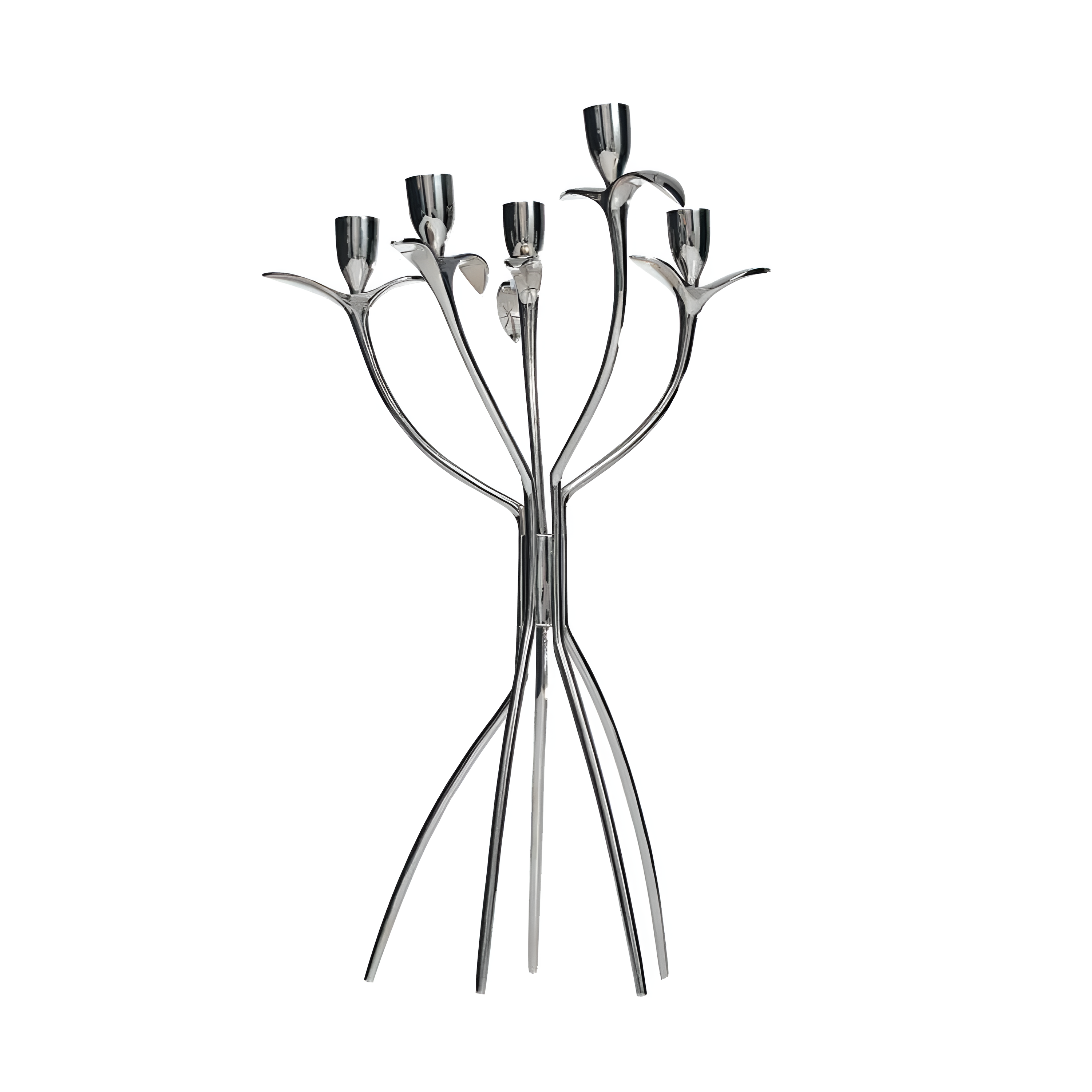 Der fünfarmige Kerzenhalter Antoniatta aus poliertem, vernickeltem Messing strahlt Brillanz und Klasse aus. Seine organische Form und subtile Ausgewogenheit machen ihn nicht nur zu einer Lichtquelle, sondern auch zu einer geschmackvollen Dekoration, die sowohl in klassische als auch in moderne Innenräume passt.