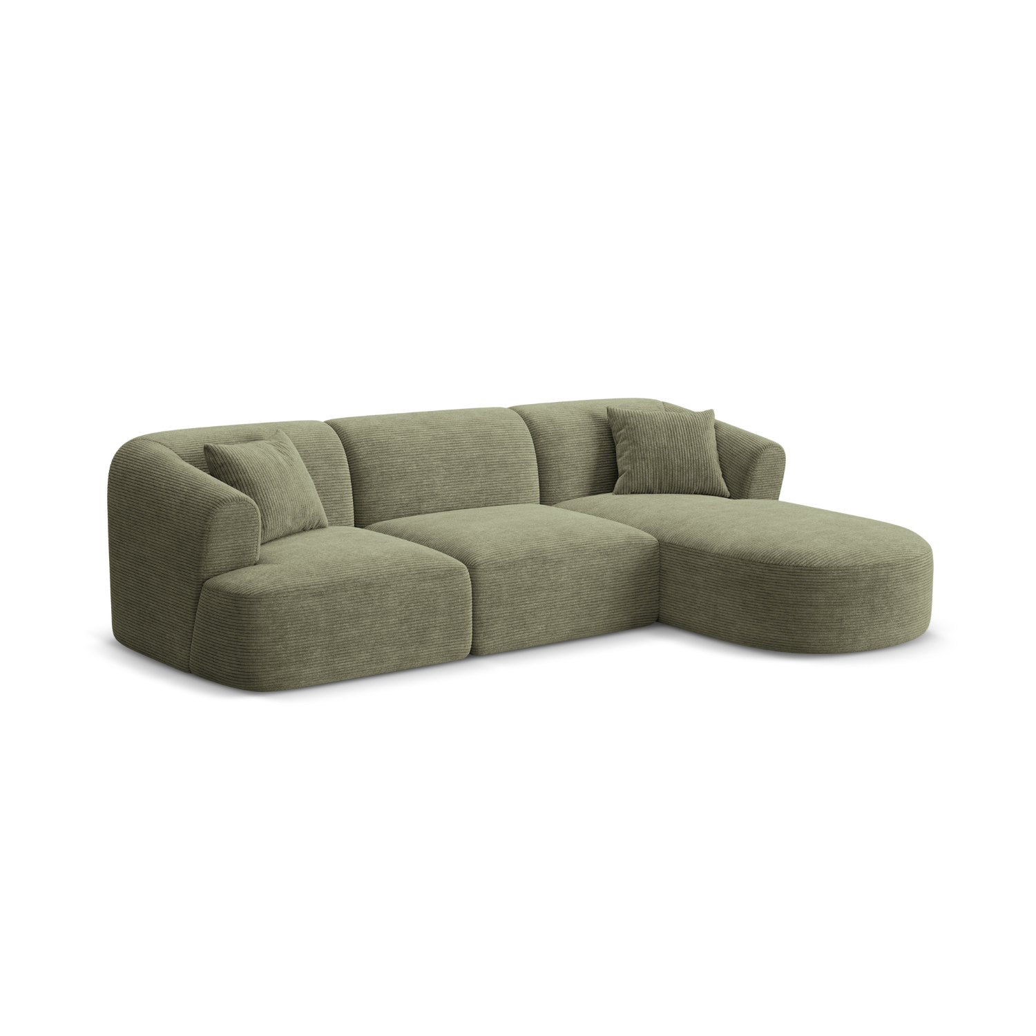 Der moderne Ecksofa aus Cord Campi ist eine hervorragende Wahl für diejenigen, die ein elegantes und gleichzeitig funktionales Möbelstück für ihr Wohnzimmer suchen. Die abgerundeten Linien und die weichen Rückenlehnen sorgen dafür, dass das Sofa in verschiedenen Innenraumgestaltungen – von minimalistisch bis hin zu gemütlicheren Stilen – großartig aussieht. Die kompakten Maße machen es auch ideal für kleinere Räume, während es gleichzeitig täglichen Komfort bietet.
