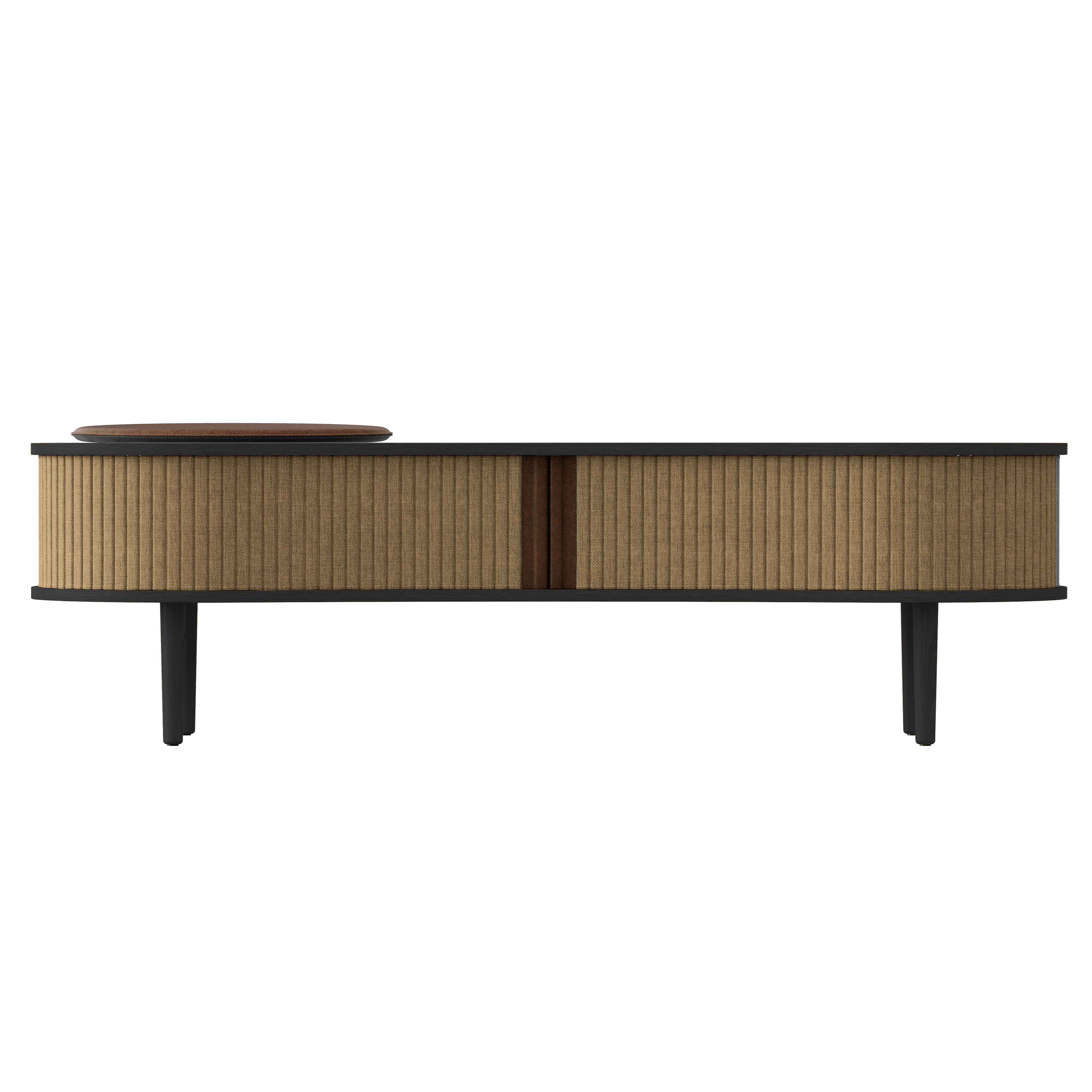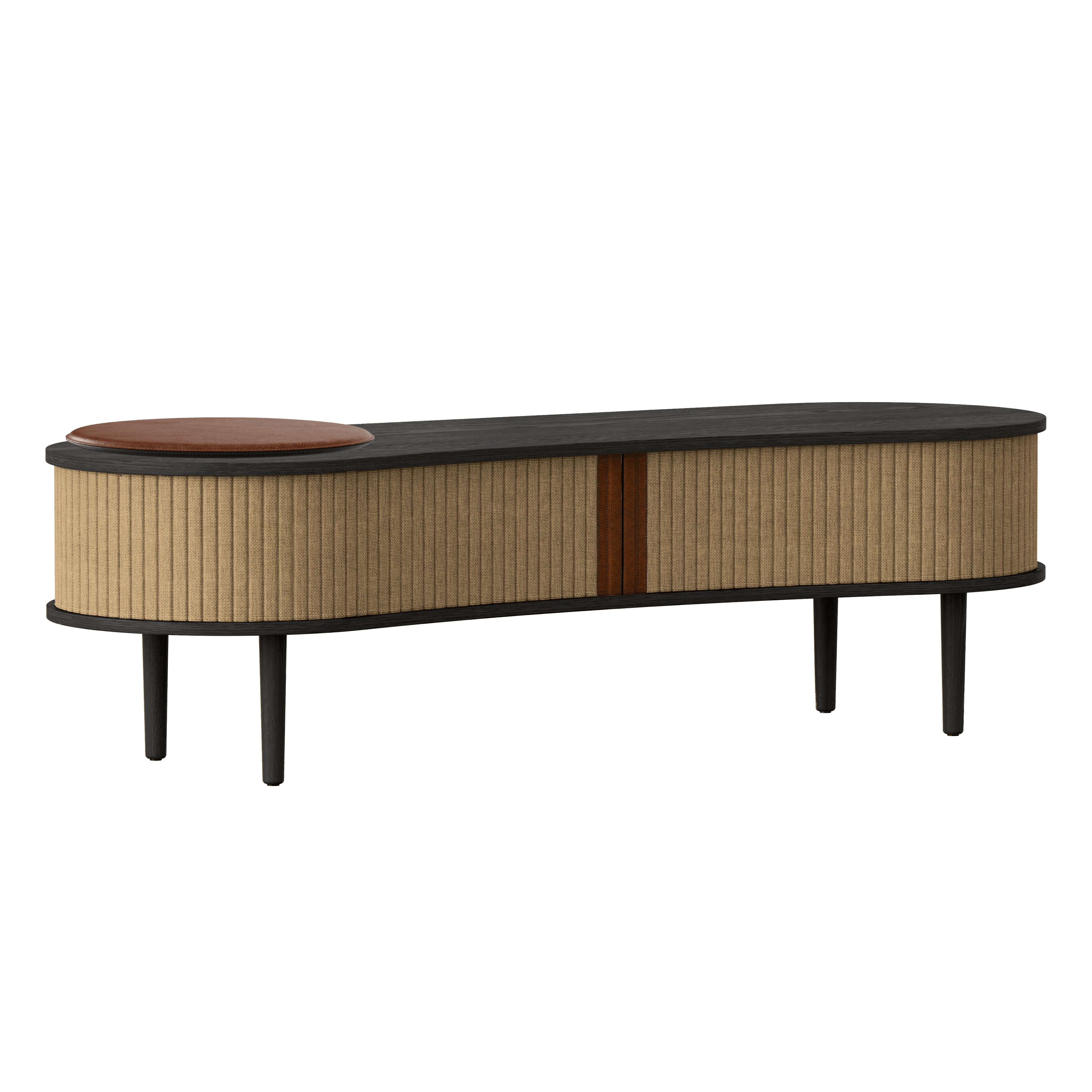Erhältlich in drei Oberflächen - Eiche, Dark Eiche und Black Eiche - mit Jalousien in vier ausgewählten Farben des Horizons, 100% recycelt. Die Jalousien sind austauschbar, sodass Sie das Erscheinungsbild der Möbel leicht erfrischen können, ohne eine neue kaufen zu müssen und gleichzeitig natürliche Ressourcen zu sparen. Es ist auch möglich, ein Sitzkissen zu kaufen, um den Komfort während des Gebrauchs zu erhöhen.
