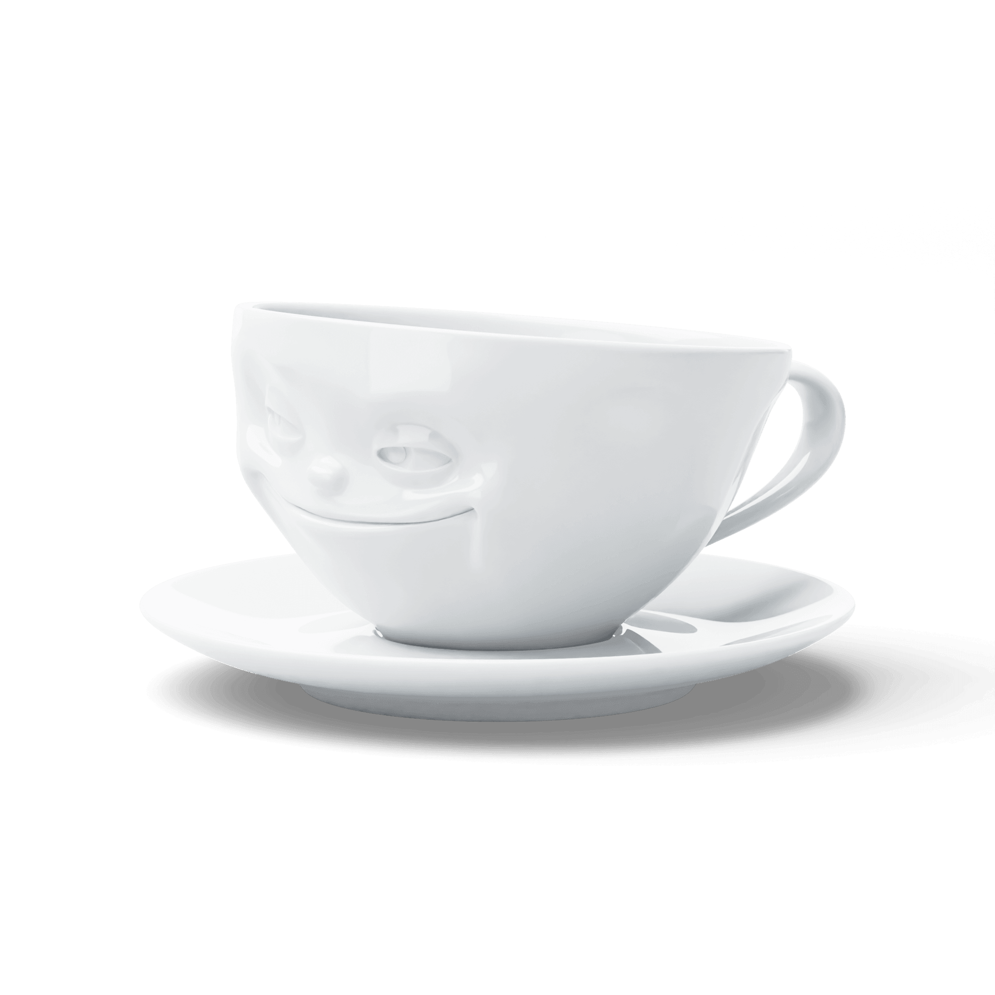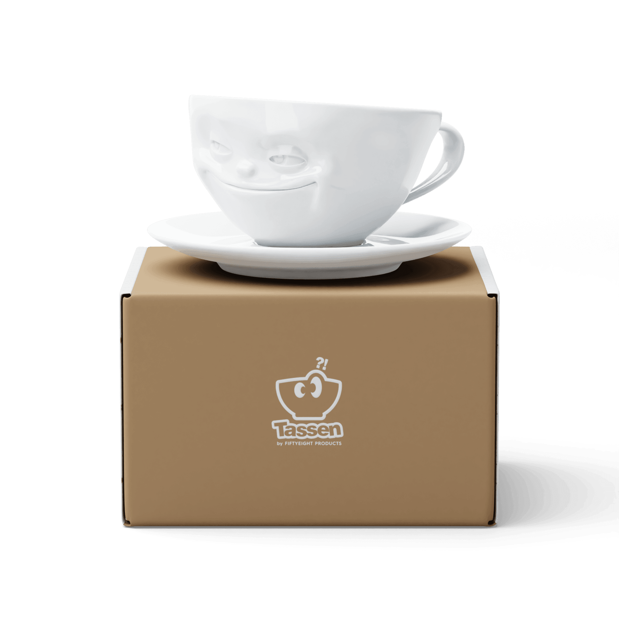 Tasse Das Grinsen mit einer Kapazität von 200 ml Weiß ist eine gute Wahl für Liebhaber von warmen Getränken wie Kaffee, Tee und heiße Schokolade. Das Set beinhaltet einen Griff, wodurch es bequem zu halten ist, unabhängig davon, ob Sie zu Hause, im Büro oder irgendwo anders sind. Darüber hinaus ist Saucer eine ideale Ergänzung, um eine Tasse auf den Tisch zu legen, ohne dass die Oberfläche geschädigt wird.