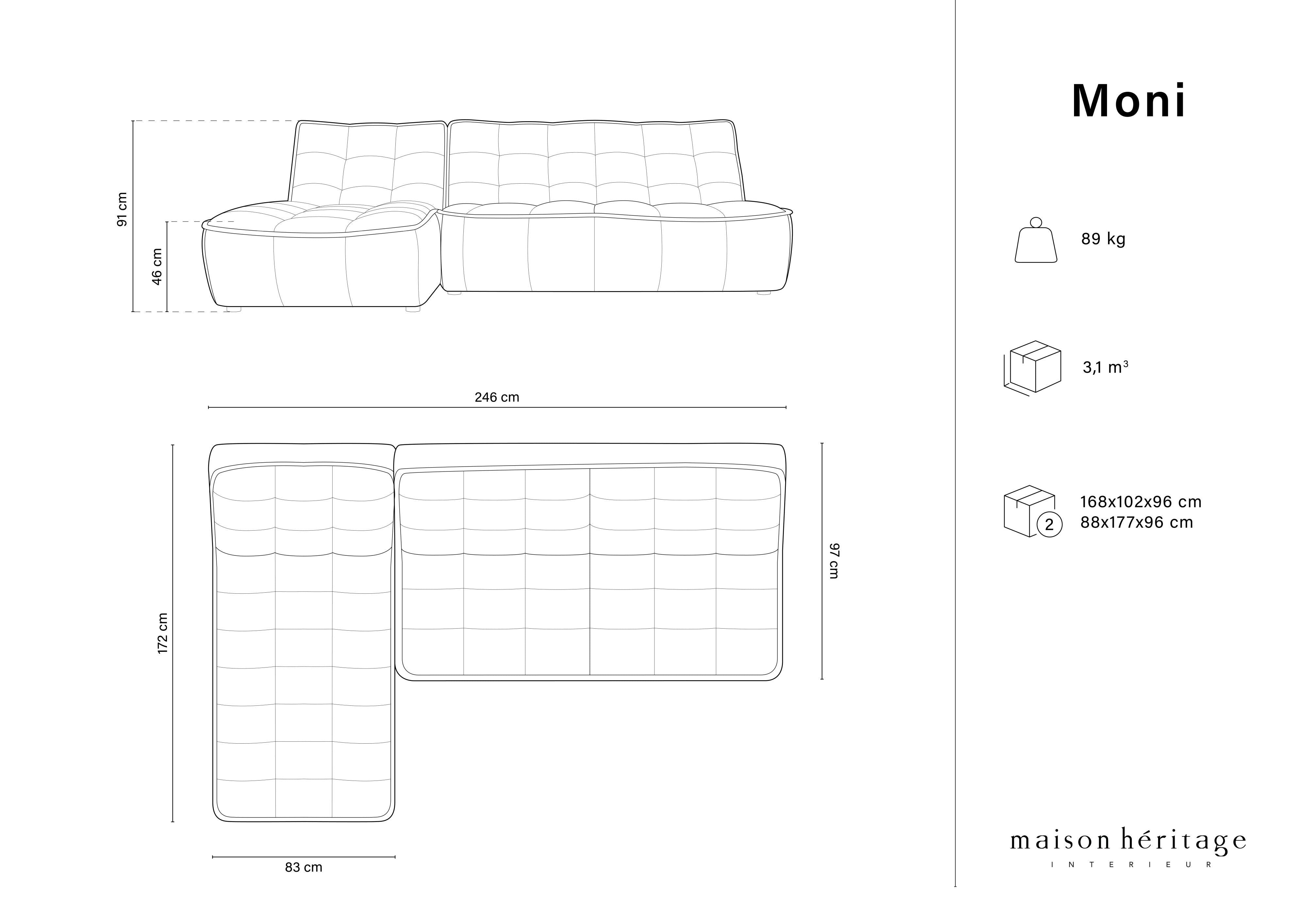 Polsterung aus strukturellem Stoff, dessen fein gewebte Struktur Samt mit einer heterogenen Oberfläche ähnelt, ist angenehm und extrem langlebig. Ergonomische Formen gewährleisten kostenlose Unterstützung. Die Moni -Kollektion umfasst mehrere Kombinationen von Sofas und Ecken sowie Elemente wie Chaise und Poufs.