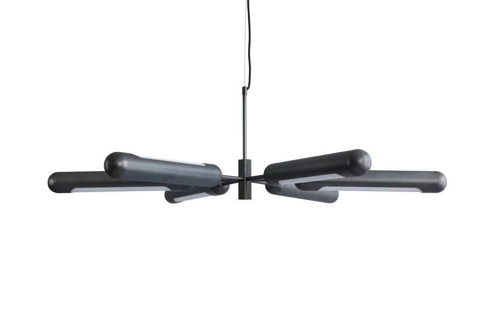 Kronleuchter Es verfügt über sechs verstellbare Arme in einer flexiblen hexagonalen Einstellung und montiert auf einem zentralen Element mit Gewinde, das eine glänzende Lampe und ein reflektierender Charakter hinzufügt. Die beiden Arme des Kronleuchters werden gerichtet, um die Beleuchtung zur Decke zu gewährleisten, während die verbleibenden Lampenschirme nach unten gerichtet sind, um den Raum unter den Kronleuchtern aufzuhellen. Die lineare Form der hängenden Lampe ist elegant und ist eine Ode für industrielle Küchenlampen aus den 1960er Jahren. Der röhrenförmige Lampenschirm ist an einer eleganten Metallwandschüssel montiert und in vertikaler Position direkt an die Wand gelegt.