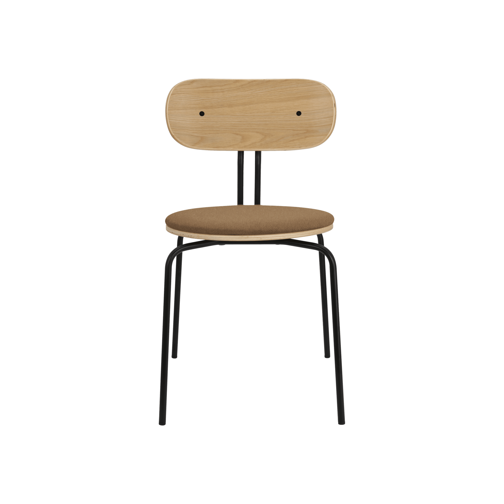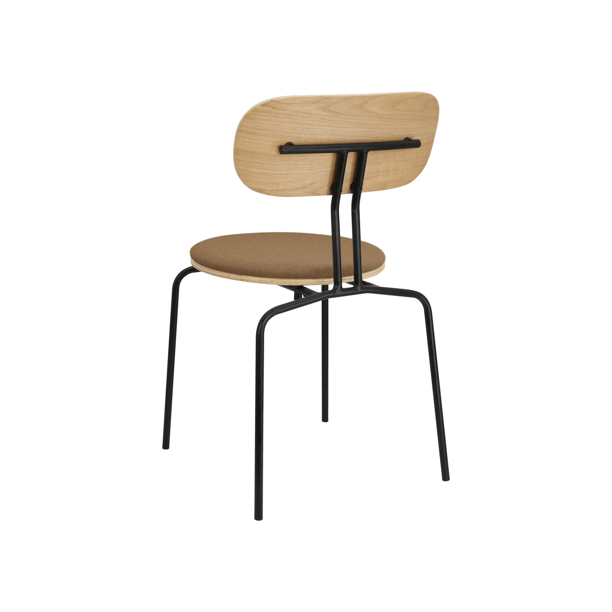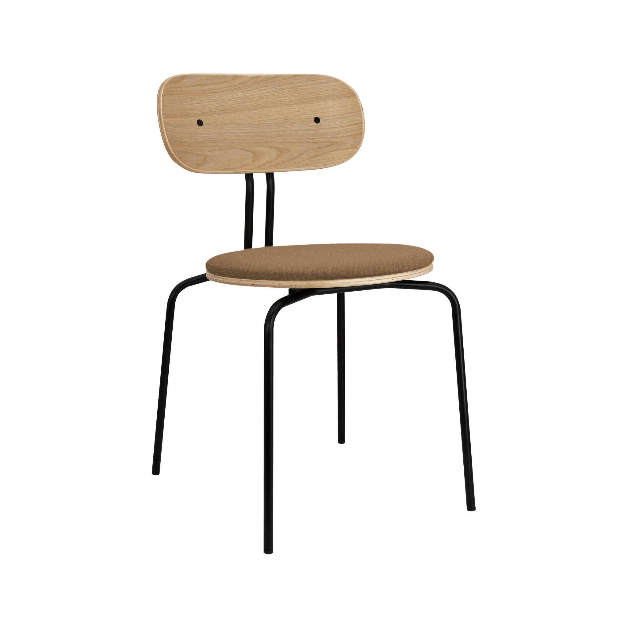 Stuhl Neugierig ist elegant, leichte und minimalistische Möbel aus Eichenfurnier. Es ist mit Messing- oder schwarzen Beinen erhältlich, und das optionale Sitzkissen bietet zusätzlichen Komfort. Sie können ein Kissen aus 17 Farben des Horizons -Stoffes auswählen, die 100% recycelt sind, sowie in einem braunen oder weißen Schatten mit Teddybärenstoff.
