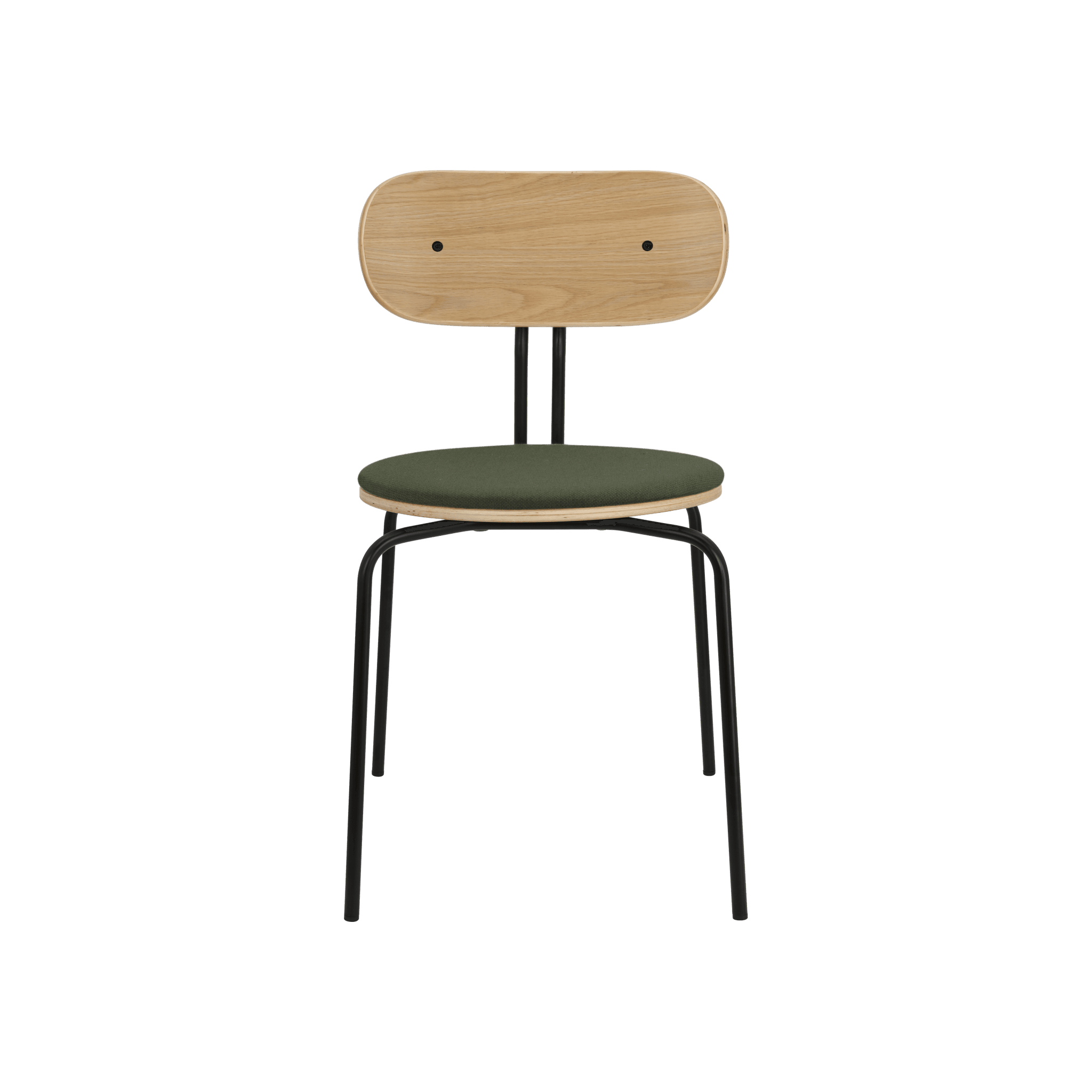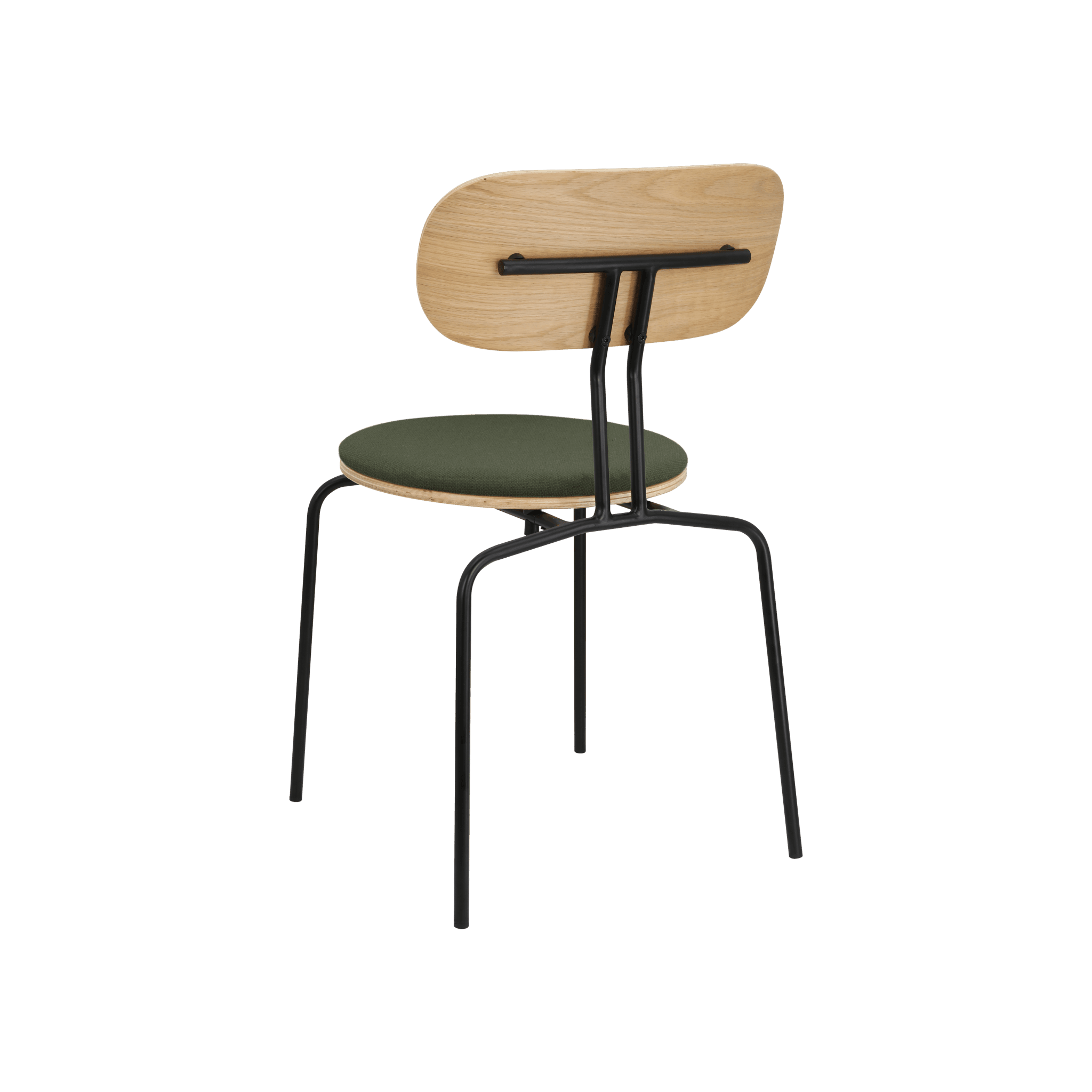 Stuhl Neugierig ist elegant, leichte und minimalistische Möbel aus Eichenfurnier. Es ist mit Messing- oder schwarzen Beinen erhältlich, und das optionale Sitzkissen bietet zusätzlichen Komfort. Sie können ein Kissen aus 17 Farben des Horizons -Stoffes auswählen, die 100% recycelt sind, sowie in einem braunen oder weißen Schatten mit Teddybärenstoff.