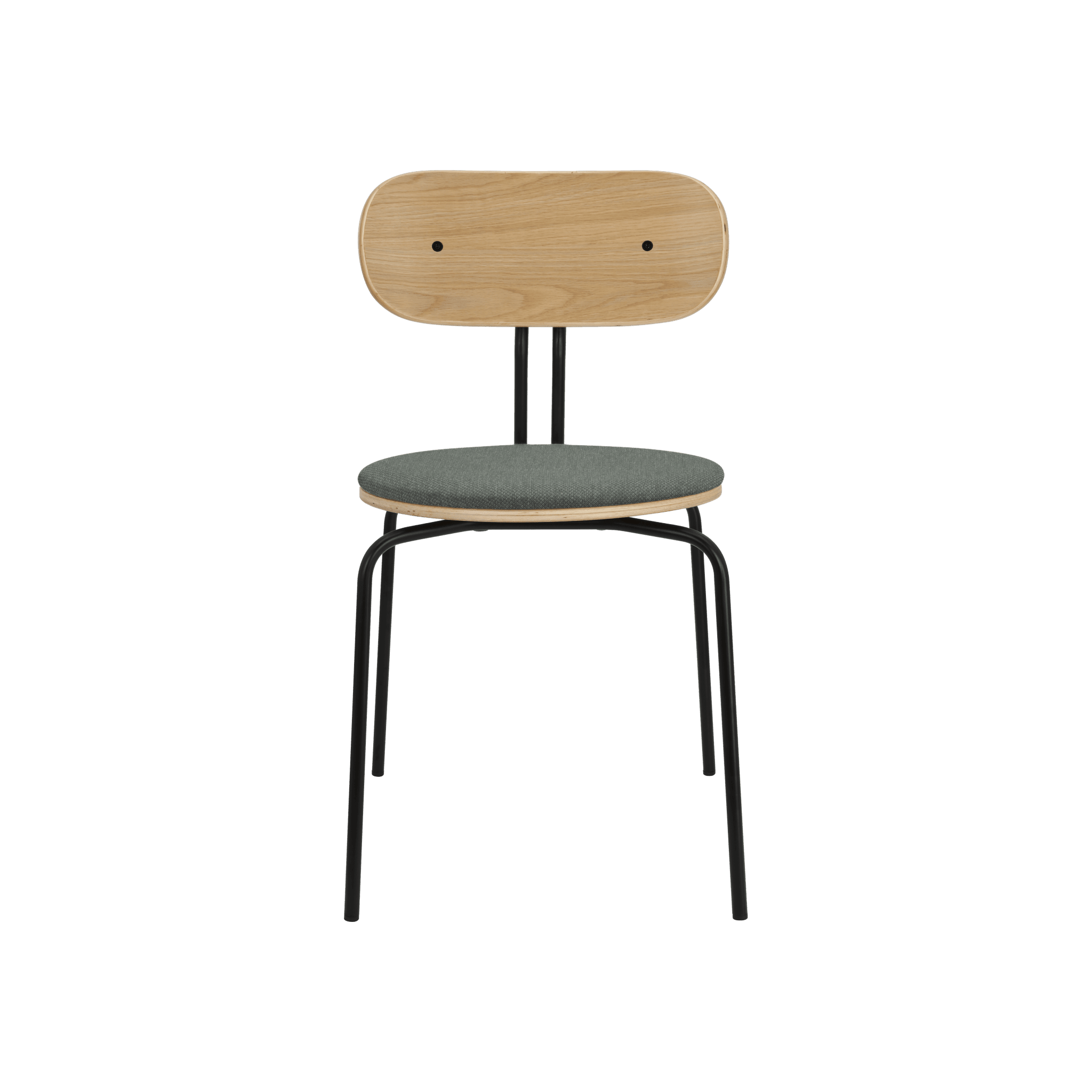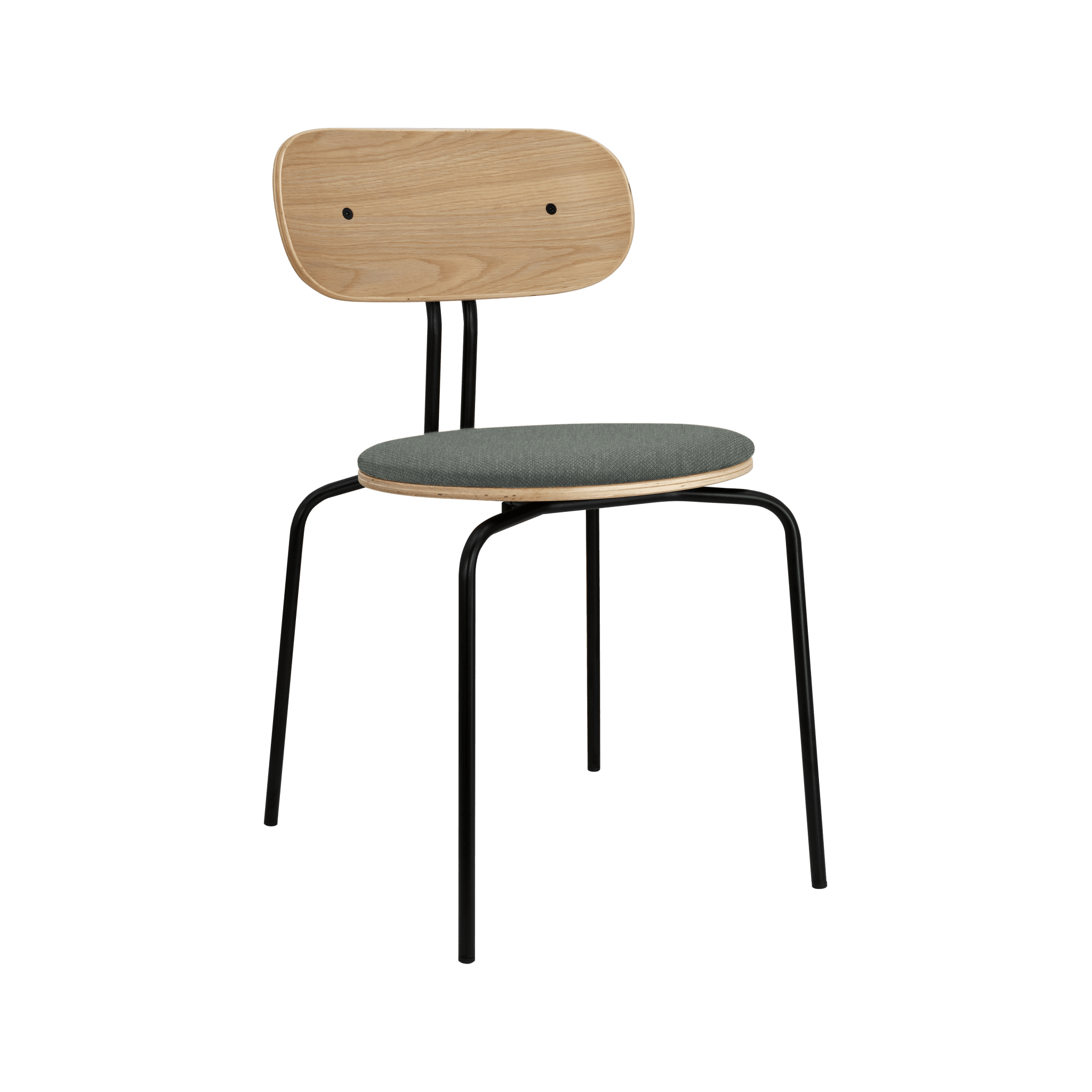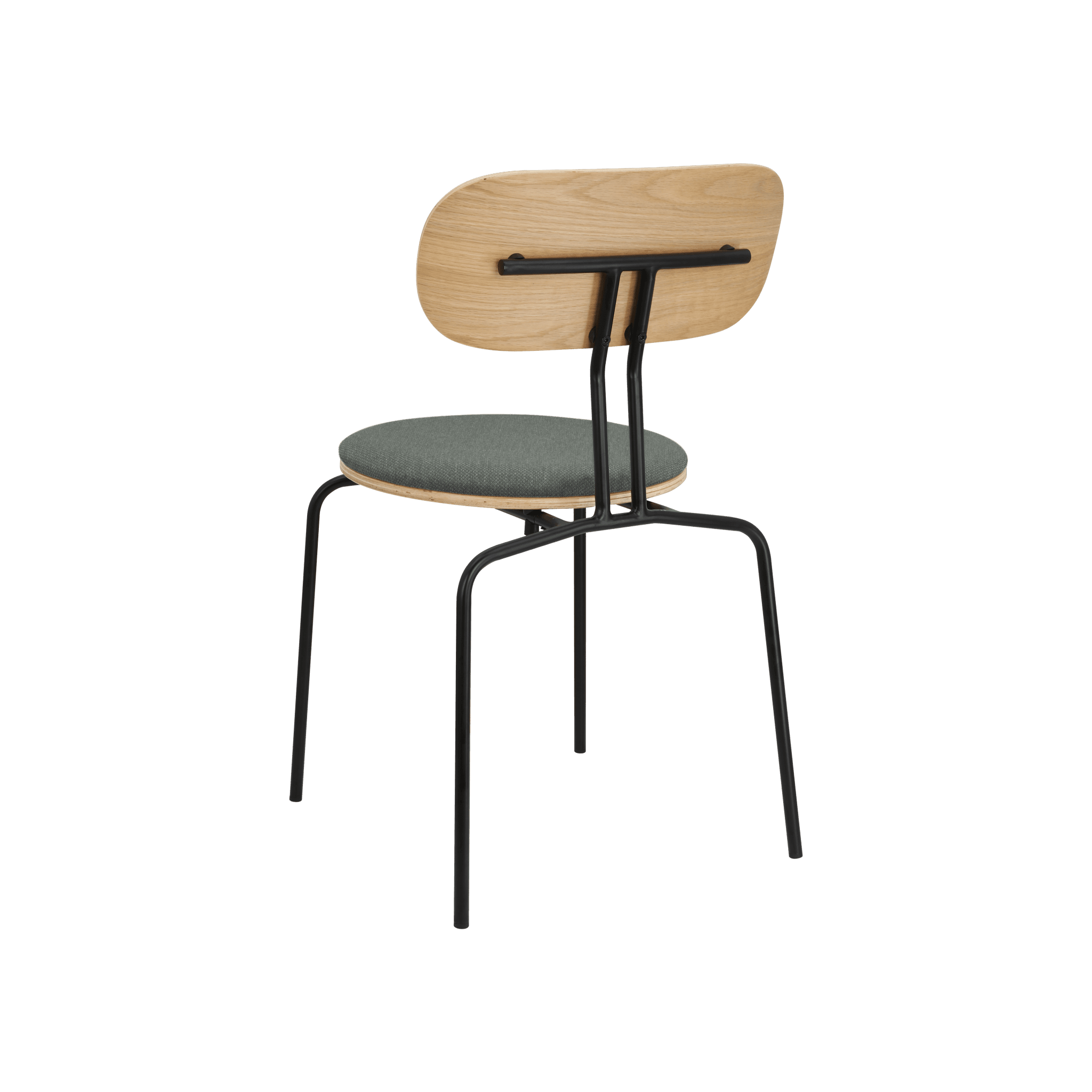 Stuhl Neugierig ist elegant, leichte und minimalistische Möbel aus Eichenfurnier. Es ist mit Messing- oder schwarzen Beinen erhältlich, und das optionale Sitzkissen bietet zusätzlichen Komfort. Sie können ein Kissen aus 17 Farben des Horizons -Stoffes auswählen, die 100% recycelt sind, sowie in einem braunen oder weißen Schatten mit Teddybärenstoff.
