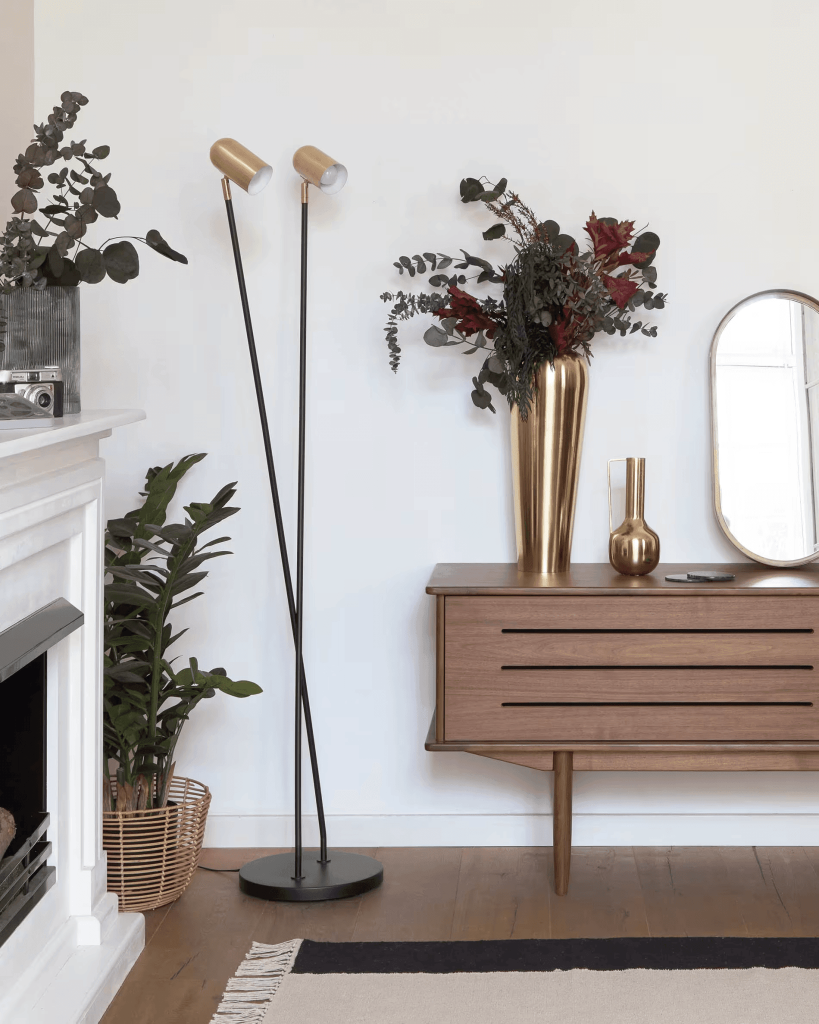 Stehlampe Schwarze Clelen ist nicht nur eine Lichtquelle, sondern auch ein ausdrucksstarkes Element des Innenstylings. Dank zweier artikulierter Lampenschirme aus Metall ermöglicht diese Lampe die Fokussierung des Lichts in verschiedenen Teilen des Raums und fügt nicht nur Funktionen, sondern auch einen einzigartigen Charakter hinzu.
