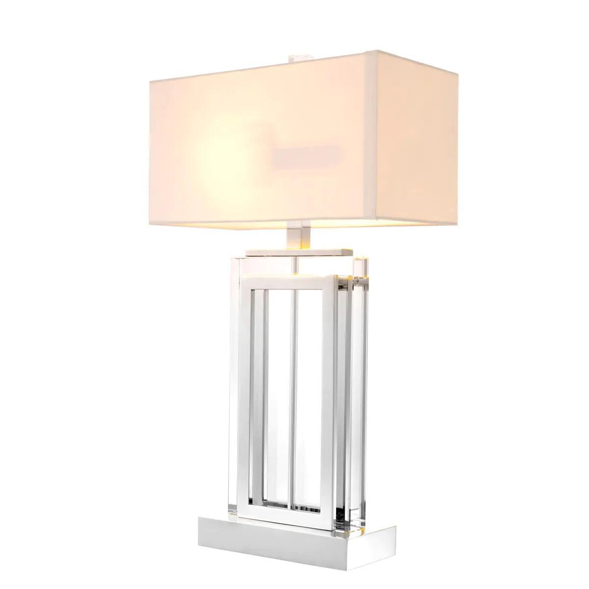 Moderne Grundlage Lampen Emanationen mit einem innovativen Designansatz. Ihr Rahmen aus transparentem Kristallglas mit einem silbernen Finish kann mit einem zarten Kunstwerk verglichen werden, das in den leichten Schimmern wie ein Juwel gefangen ist. Es ist wie ein Stück Raum, das in einer Kristallmagieschachtel eingeschlossen ist. Weißer, rechteckiger Lampenschirm ist wie ein Rahmenrahmen, bei dem das Spiel von Licht und Schatten stattfindet.