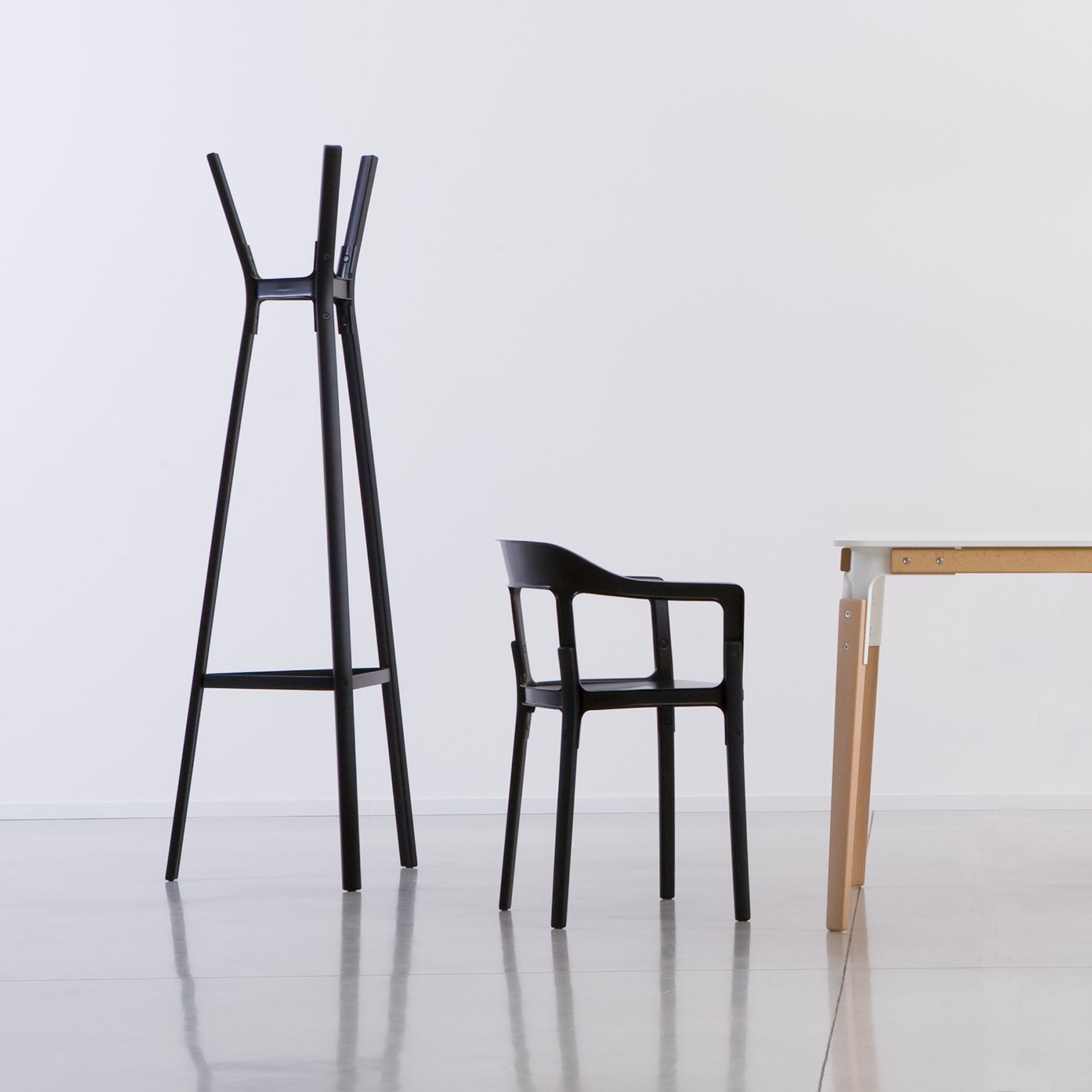 Steelwood ist Elegante und minimalistische Bodengarderobe, entworfen vom Duo Ronan & Erwan Bouroullec. Die Kombination aus warmem Holz und lackiertem Stahl verleiht dem Design einen modernen und zugleich zeitlosen Charakter. Die Struktur basiert auf drei schlanken Beinen, die sich nach oben hin leicht verbreitern und so einen stabilen und funktionalen Platz zum Aufhängen von Mänteln, Jacken oder Taschen schaffen. Das Ganze wirkt leicht und passt perfekt in Wohn-, Büro- oder Hotelräume.