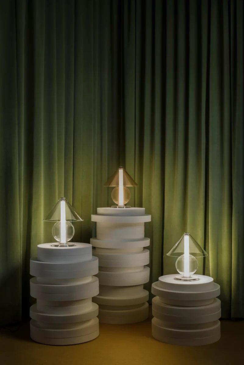 Fragile synthetisiert die Vergangenheit und Gegenwart. Es erinnert an die Kennzeichen der Vergangenheit, wie beispielsweise Öllampen, die auch von unten nach oben oder Kerzen beleuchten; Sein Designer verwendet jedoch die Sprache von Glas, um die Zerbrechlichkeit des gegenwärtigen Moments auszudrücken. Daher soll dieses neue Projekt eine Hommage an die Tischlampe sein. Der Leuchten mit einer langen Geschichte, die dank der Verwendung von Material wie Glas erneut mit der Delikatesse seiner Formen überrascht.