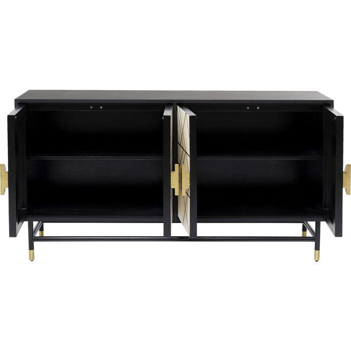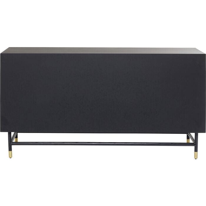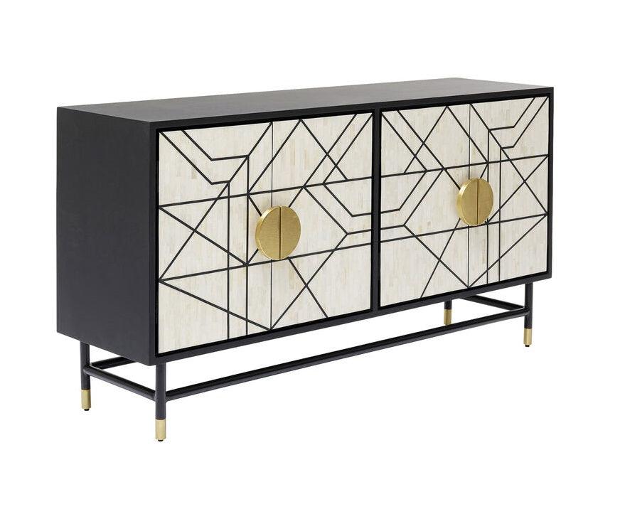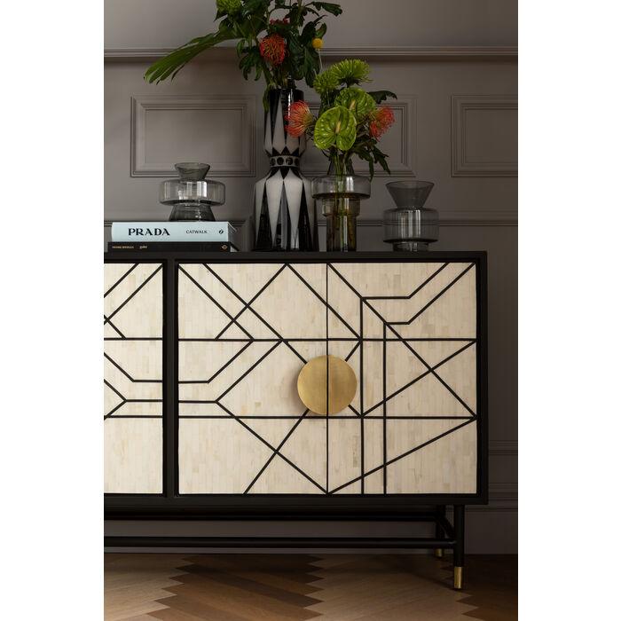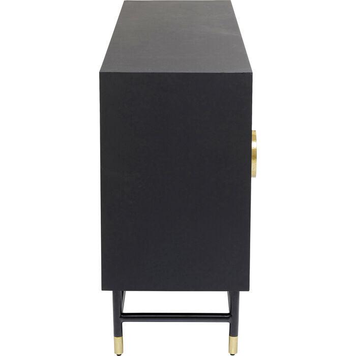 Ungewöhnliche, runde Griffe in altem Messing, schwarzem Körper und eleganter Basis - Kommode Credenka gibt Ihrem Salon einen einzigartigen, individuellen Charakter. Es ist einzigartig und gleichzeitig zeitloses Erscheinungsbild fantastisch mit modernen und klassischen Möbeln eingebaut.