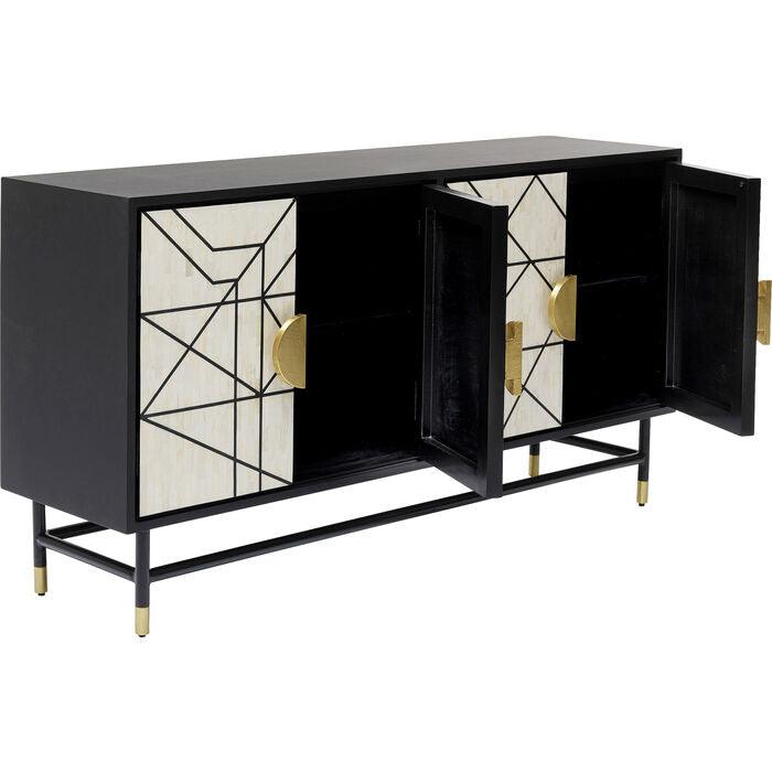 Meisterwerk unter den Schränken: Die handgefertigte Front ähnelt einer grafischen Arbeit. Dieses Möbel kombiniert Elemente im Art Deco -Stil mit den Merkmalen des japanischen Designs. Dies ist eine äußerst elegante Möglichkeit, einen Speicherplatz zu schaffen.