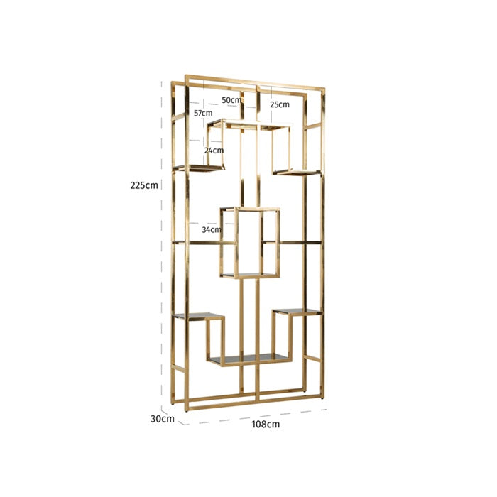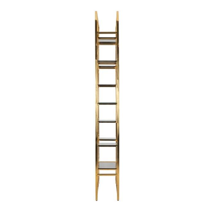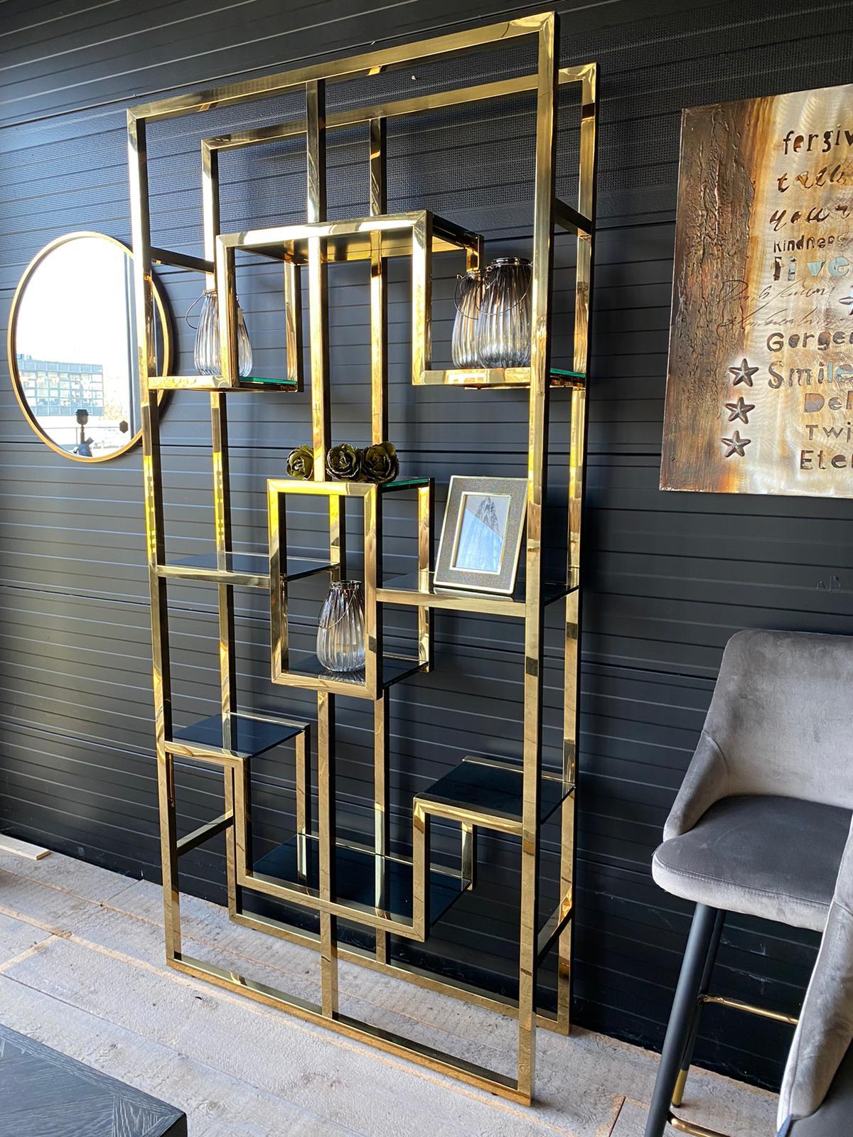 Goldener Bücherregal Florence ist eine interessante Kombination aus Art -Deco- und Glamour -Stil. Dank der charakteristischen Verbindungen, die in den raffinierten Formen angeordnet sind, ist das Bücherregal nicht nur elegant, sondern auch modern. Schwarzes Glas, das verwendet wird, um Regale zu erzeugen, sind Kontrast zu Metallelementen und vermitteln gleichzeitig den Eindruck einer perfekten Passform.