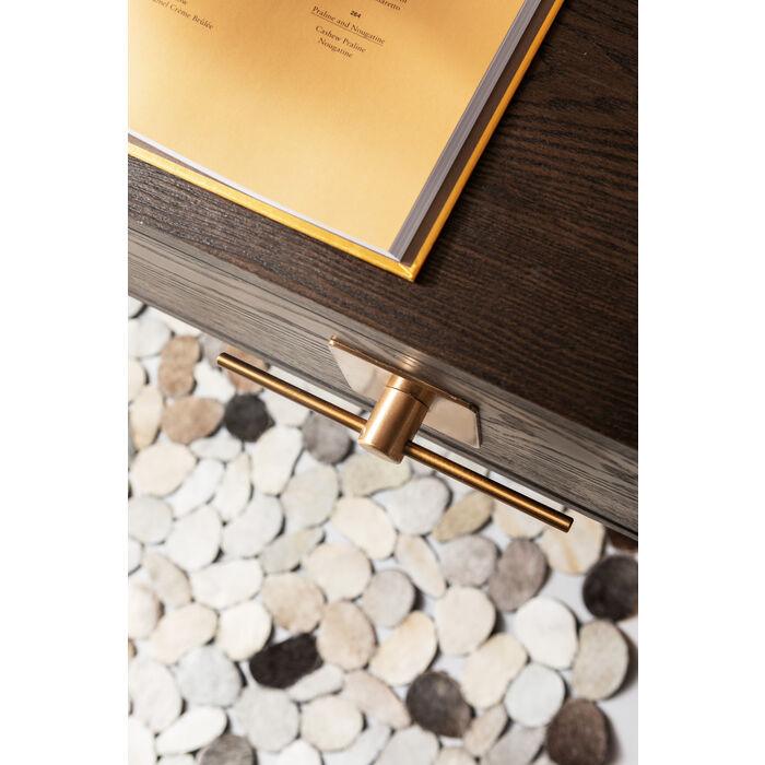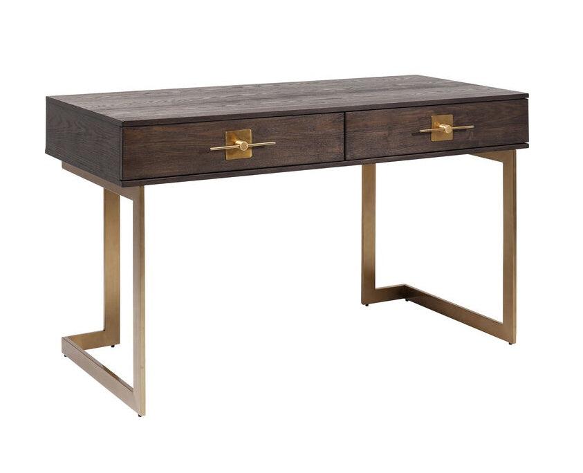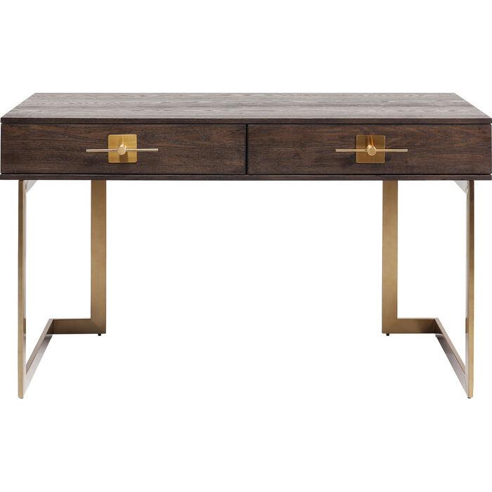 Ein klassischer Schreibtisch, der dank Brass -Details zeitlose, moderne Möbel wird. Ein modisches Element für ein Heimbüro - wenn es nicht wie ein typischer Arbeitsplatz aussieht. Der neue asiatische Stil stellt die Welt zu Ihrem Zuhause vor.
