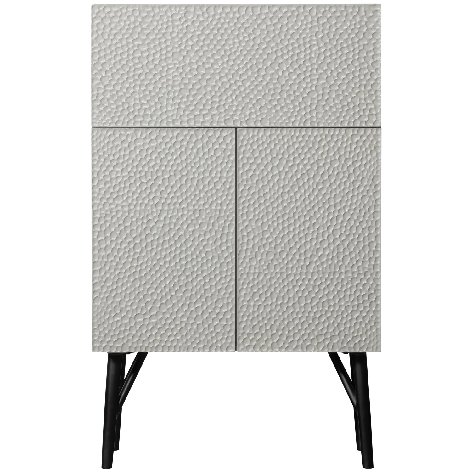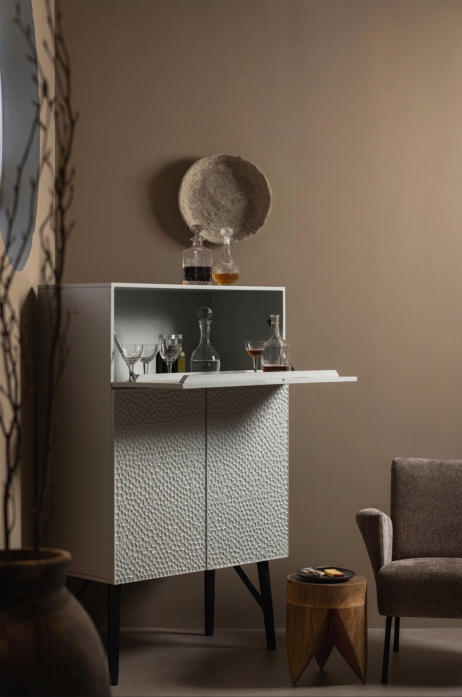 Bar Geschnitzt ist ein ausdrucksstarker Vorschlag, Ihre Lieblingsgetränke und Glas zu lagern und anzuzeigen. Die geschnitzte Kollektion zeichnet sich durch ein spektakuläres grafisches Muster an den Fronten aus, das von orientalischer skulpturaler Kunst inspiriert ist. Jede Front ähnelt einer Miniatur -Wüstenlandschaft, und der zarte Nebelschatten verleiht dem Ganzen einen eleganten und ruhigen Charakter.