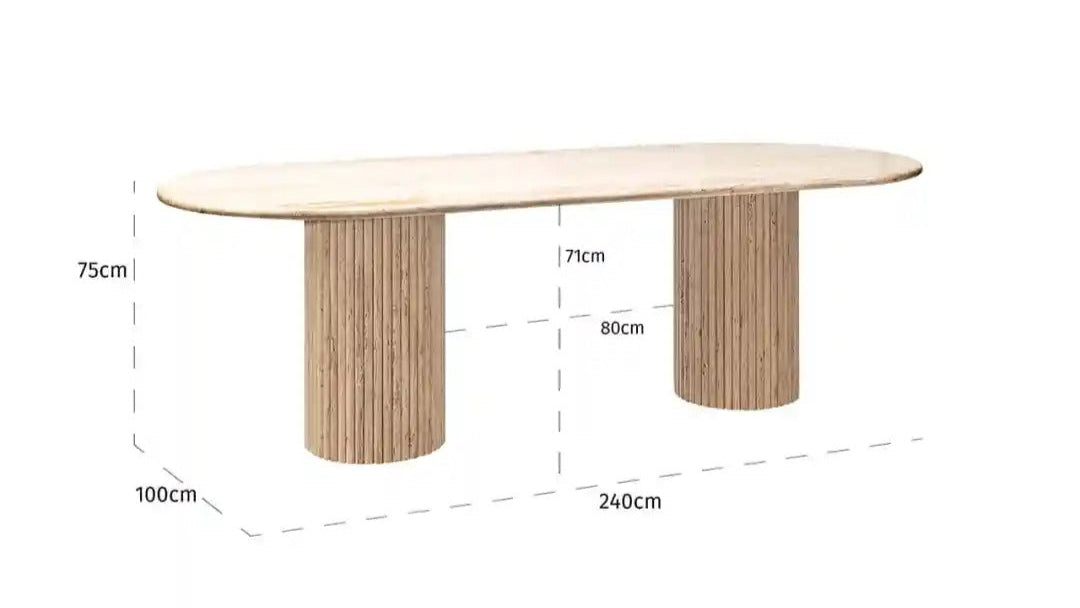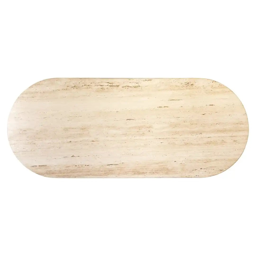 Eleganter Tisch La Cantera mit einer Tischplatte aus Travertin ist ein luxuriöses Möbelstück mit außergewöhnlichem Charakter, das natürliche Eleganz und Raffinesse in Ihr Zuhause bringt. Die ovale Tischplatte mit einer Dicke von 3 cm begeistert durch die einzigartige Maserung des Steins, während das Gestell mit geriffelten zylindrischen Beinen ihm moderne Leichtigkeit und dekorativen Ausdruck verleiht. Der Travertin in hellem Farbton harmoniert wunderschön mit neutralen Arrangements und bringt einen subtilen Glanz in den Raum.