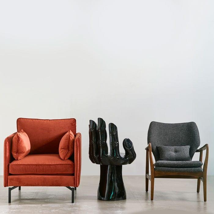 Stuhl Hand in Schwarz ist ein exzentrisches Projekt, das mit seinem Aussehen und seiner originellen Form beeindruckt. Dieses Modell ist nicht nur ein komfortabler Sitz, sondern auch eine ungewöhnliche Dekoration, die fast in den inneren Charakter und für interessante Designs führen wird.