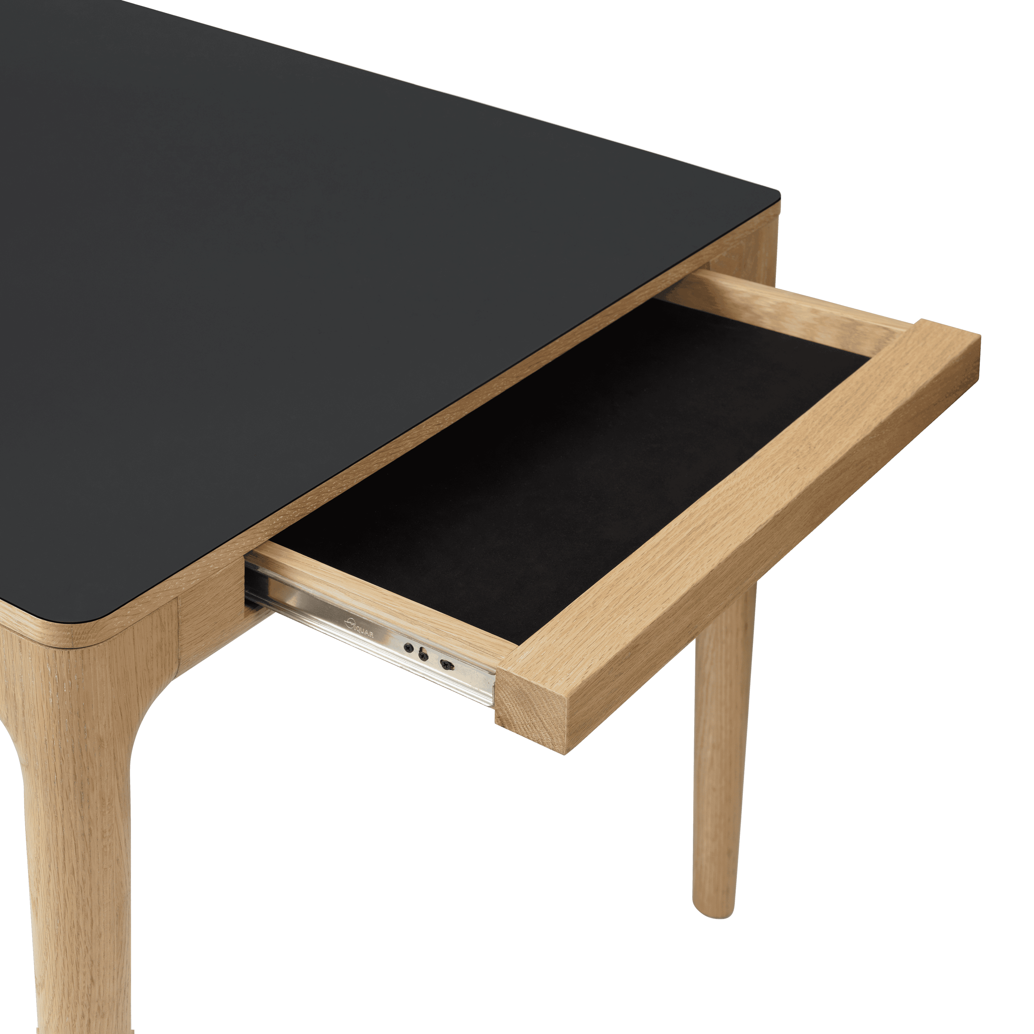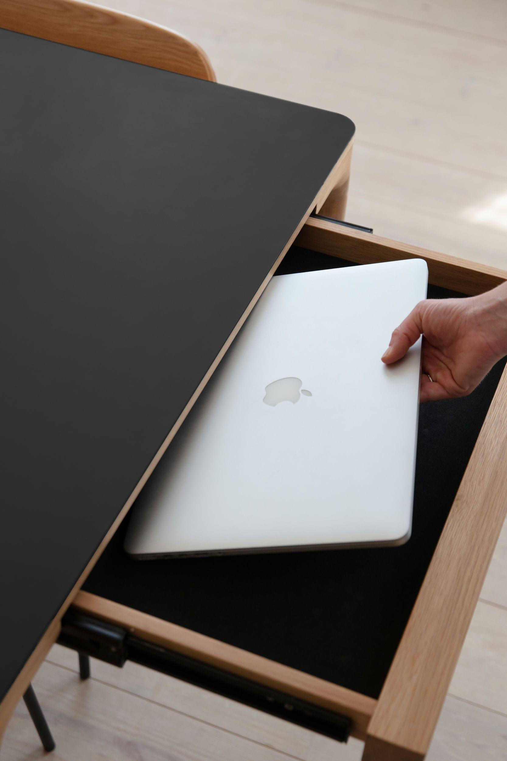 Beide Enden der Tabelle verbergen zwei mit zarten Stoff gepolsterte Schubladen, sodass Sie schnell alle Störungen und Spuren verbergen können, was manchmal den Alltag zurückbleibt. Diese beiden Schubladen fungieren auch als Griffe für zwei verlängerte Platten, um die Tischstabilität auch nach ihrer Entwicklung zu gewährleisten. Die Verlängerungsplatten sind am Tisch diskret versteckt und können je nach Ihren Anforderungen leicht hinzugefügt oder entfernt werden.
