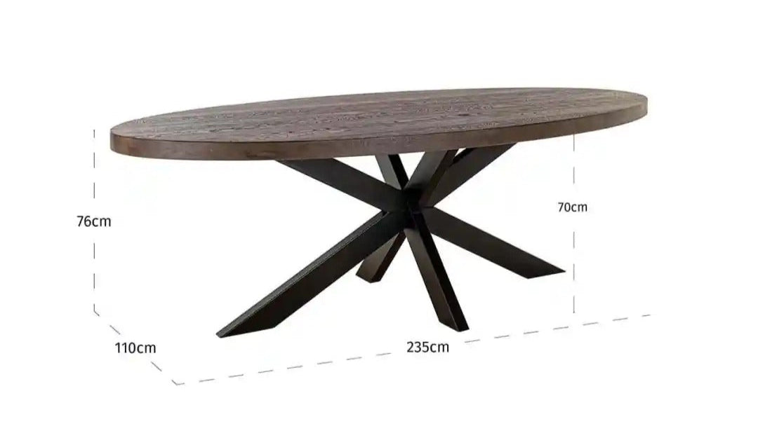 Eleganter ovaler Tisch Watson ist eine Kombination aus der natürlichen Schönheit des Holzes und der Solidität von Metall, die ein beeindruckendes Möbelstück für das Esszimmer oder den Wohnbereich schafft. Die dicke Eichenplatte begeistert mit ihrer tiefen Maserung, während das schwarze, metallische Gestell in Form von sich ausbreitenden Armen dem Ganzen einen modernen, industriellen Charakter verleiht.