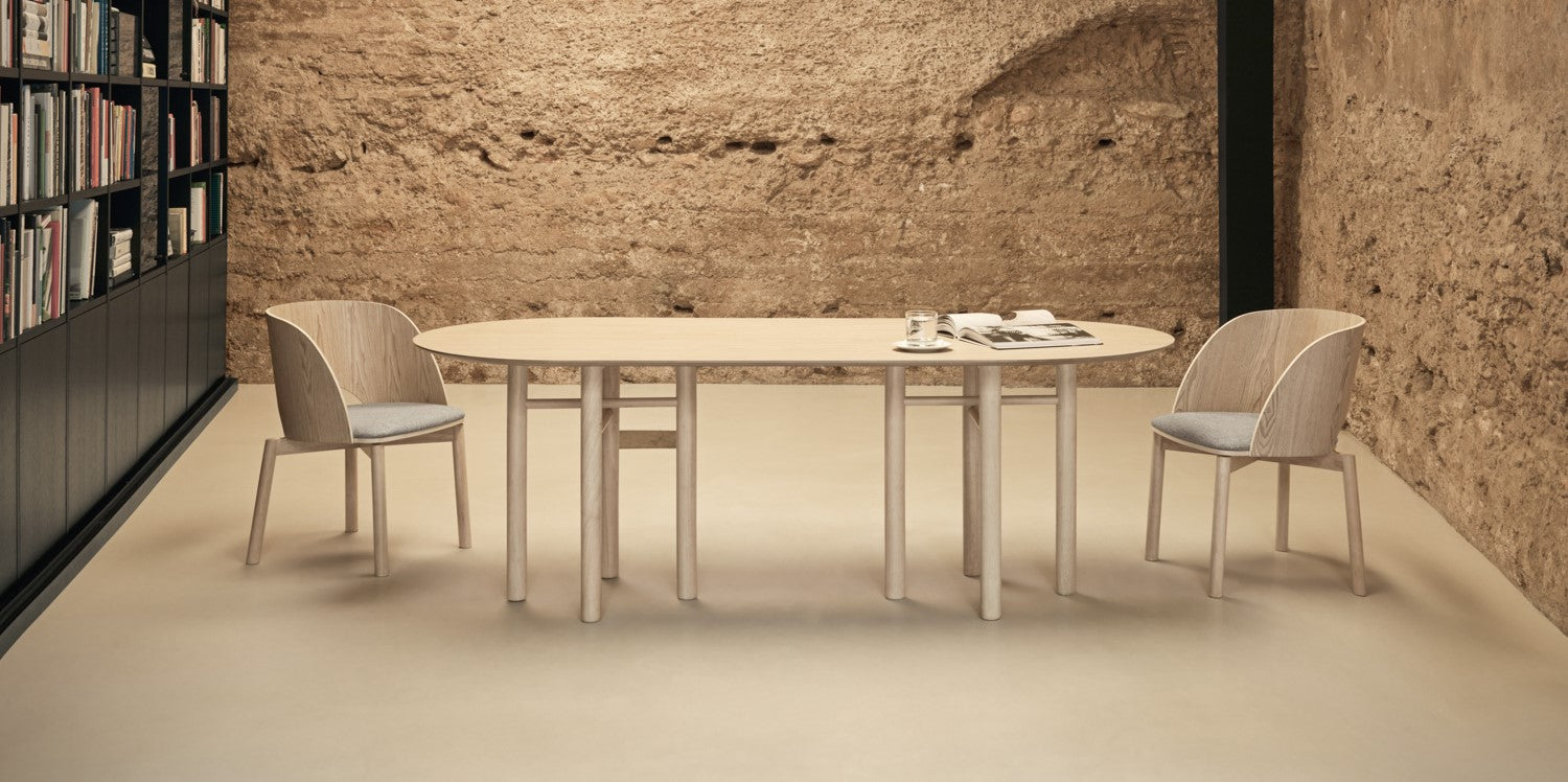 Der allgegenwärtige Minimalismus wurde kombiniert mit unglaublicher Präzision Was macht ihn aus Tisch Junco wird in fast jedem Raum arbeiten. Die Tischbeine sind paarweise mit zylindrischen Holzkreuzstangen verbunden, die auf originelle Weise überqueren - Dieses Design beeindruckt von Funktionalität und Aussehen.
