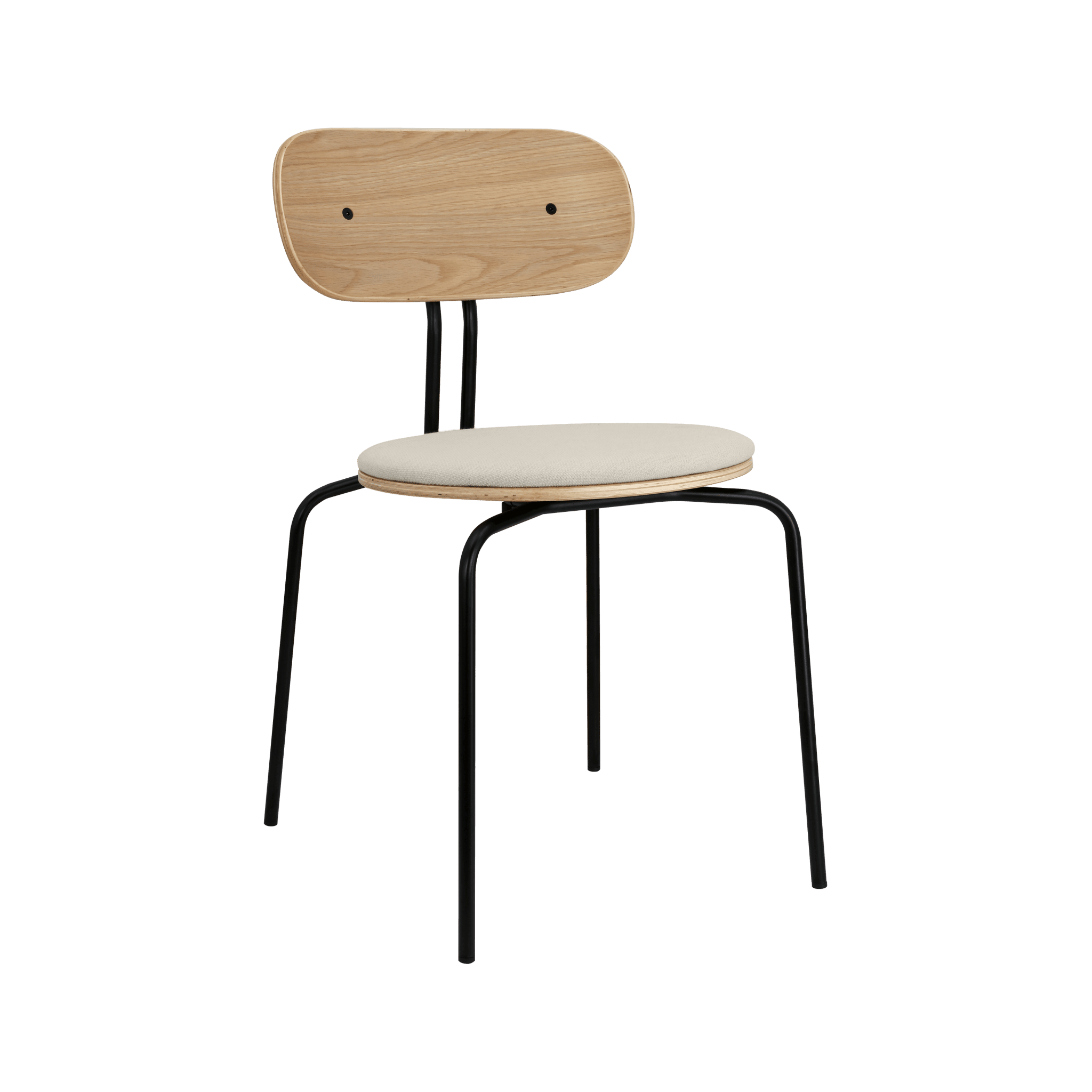 Stuhl Neugierig ist elegant, leichte und minimalistische Möbel aus Eichenfurnier. Es ist mit Messing- oder schwarzen Beinen erhältlich, und das optionale Sitzkissen bietet zusätzlichen Komfort. Sie können ein Kissen aus 17 Farben des Horizons -Stoffes auswählen, die 100% recycelt sind, sowie in einem braunen oder weißen Schatten mit Teddybärenstoff.