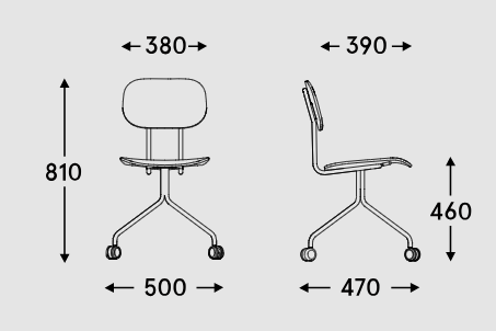 Stuhl Es ist mit einem einfachen Sperrholzsitz erhältlich, was sie ideal für den Raum macht, bei dem sich Benutzer häufig ändern. Die Höhe des Sitzes - 460 mm -, der auf Standardtische zugeschnitten ist, bietet Komfort, und die mobile Basis auf Rädern ermöglicht die freie Bewegung und die Anpassung der Position an die individuellen Bedürfnisse des Benutzers.