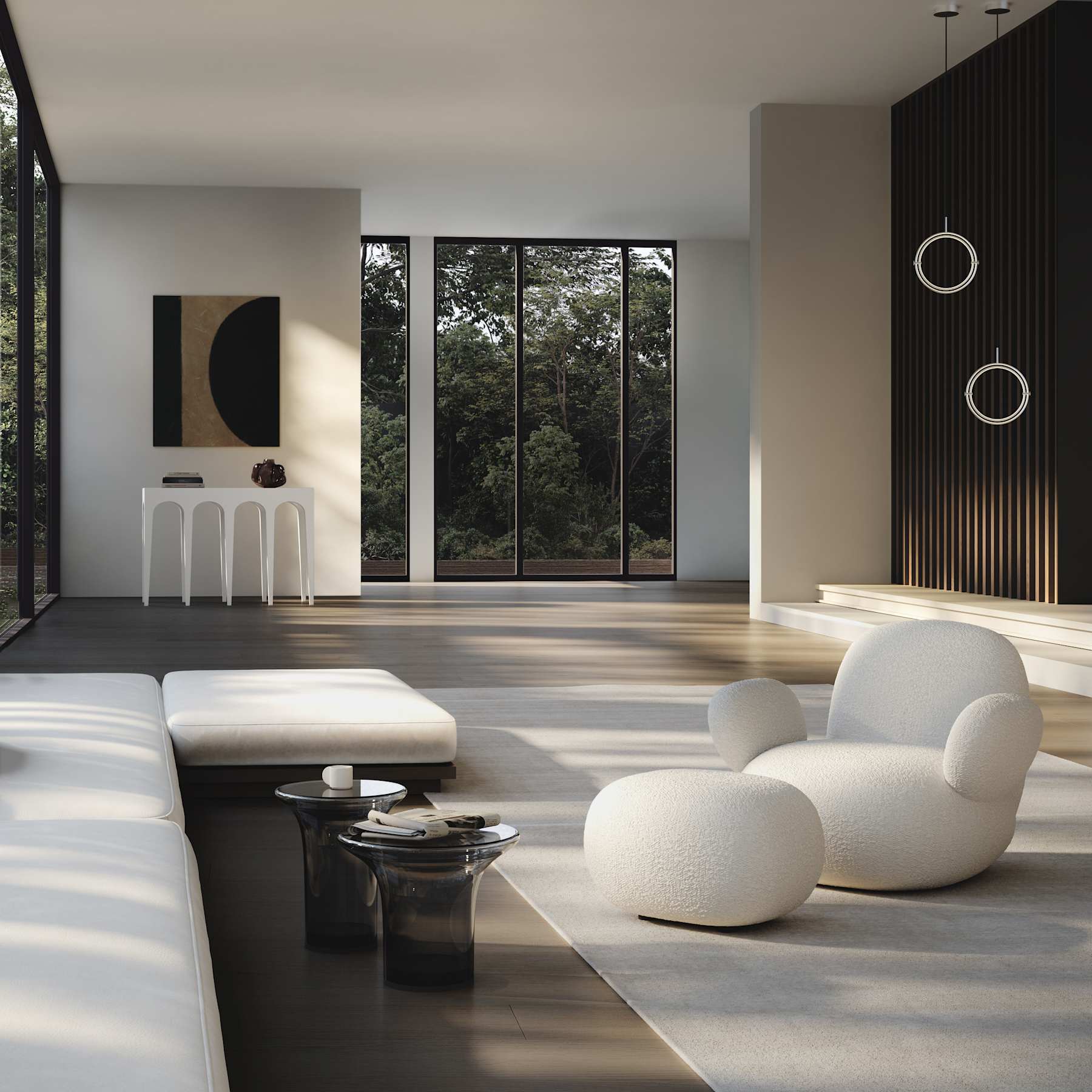 Der Toe Flat -Sessel ist eine Hommage an das futuristische Design der 1970er Jahre, transformiert in einen modernen Sessel mit voller, weicher Polsterung. Seine ausdrucksstarke Silhouette vereint massive Form mit minimalistischem Charakter, während die fließenden, unsichtbaren Verbindungen zwischen den einzelnen Elementen die skulpturale Qualität des Designs betonen. Die glatten, ovalen Armlehnen sind nicht nur ein Blickfang, sondern bieten auch eine bequeme und stabile Unterstützung der Arme.