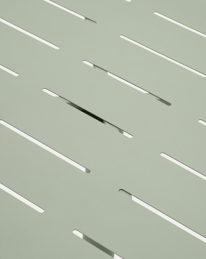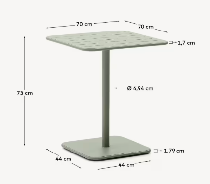 Brai es Gartentisch, was harmonisch minimalistisches Design mit Ausdauer kombiniert. Aus verzinktem Stahl besteht es resistent gegen Abrieb und Korrosion, was auch bei anspruchsvollen externen Bedingungen die Langlebigkeit gewährleistet. Die zementverstärkte Basis garantiert Stabilität, und Plastikbeinschutz schützen den Boden vor Kratzern.