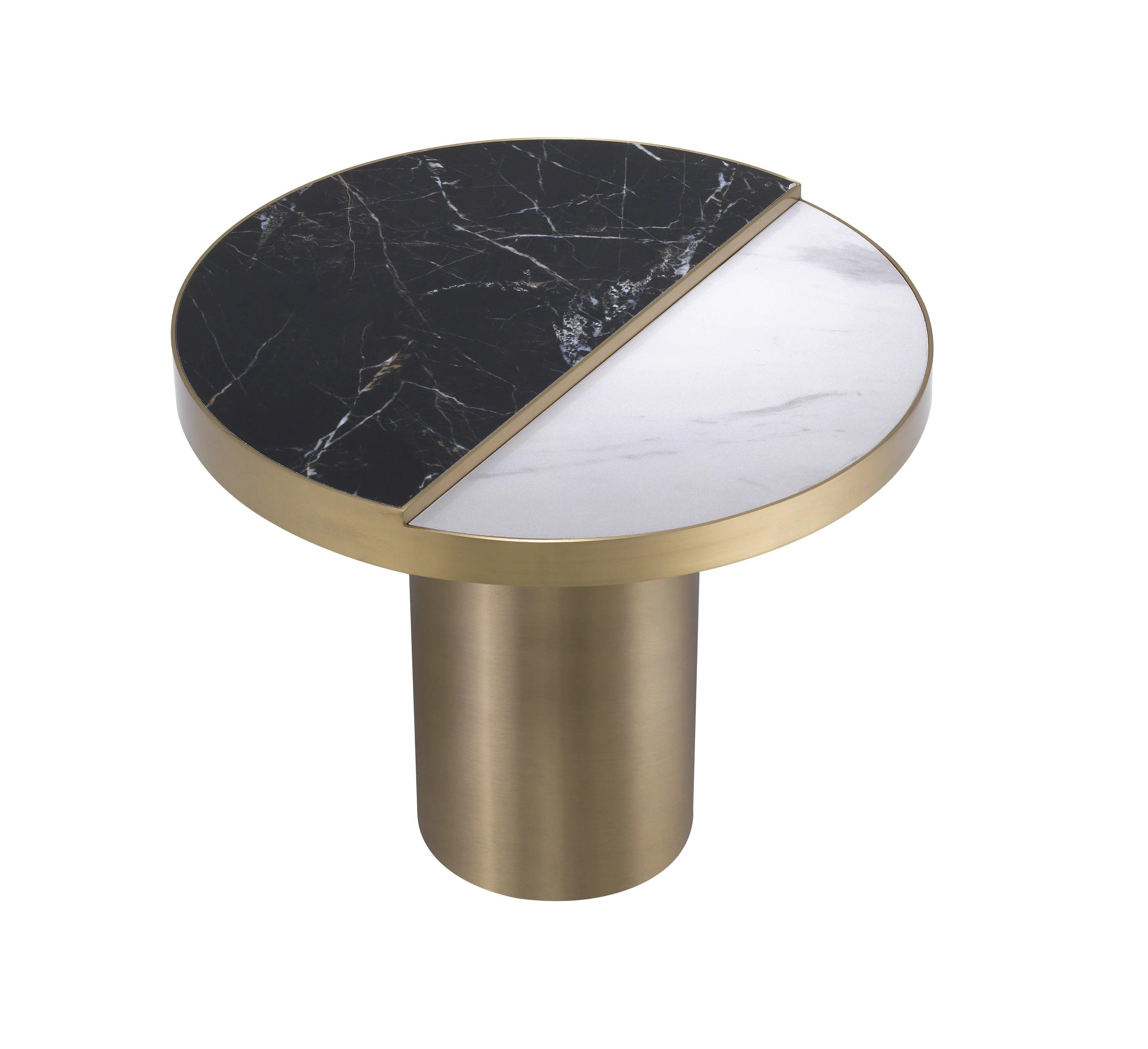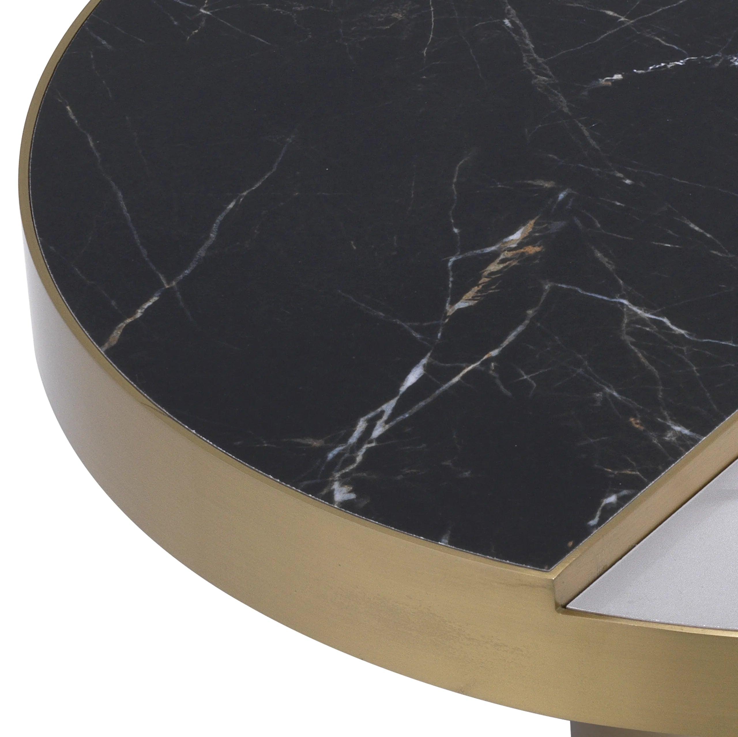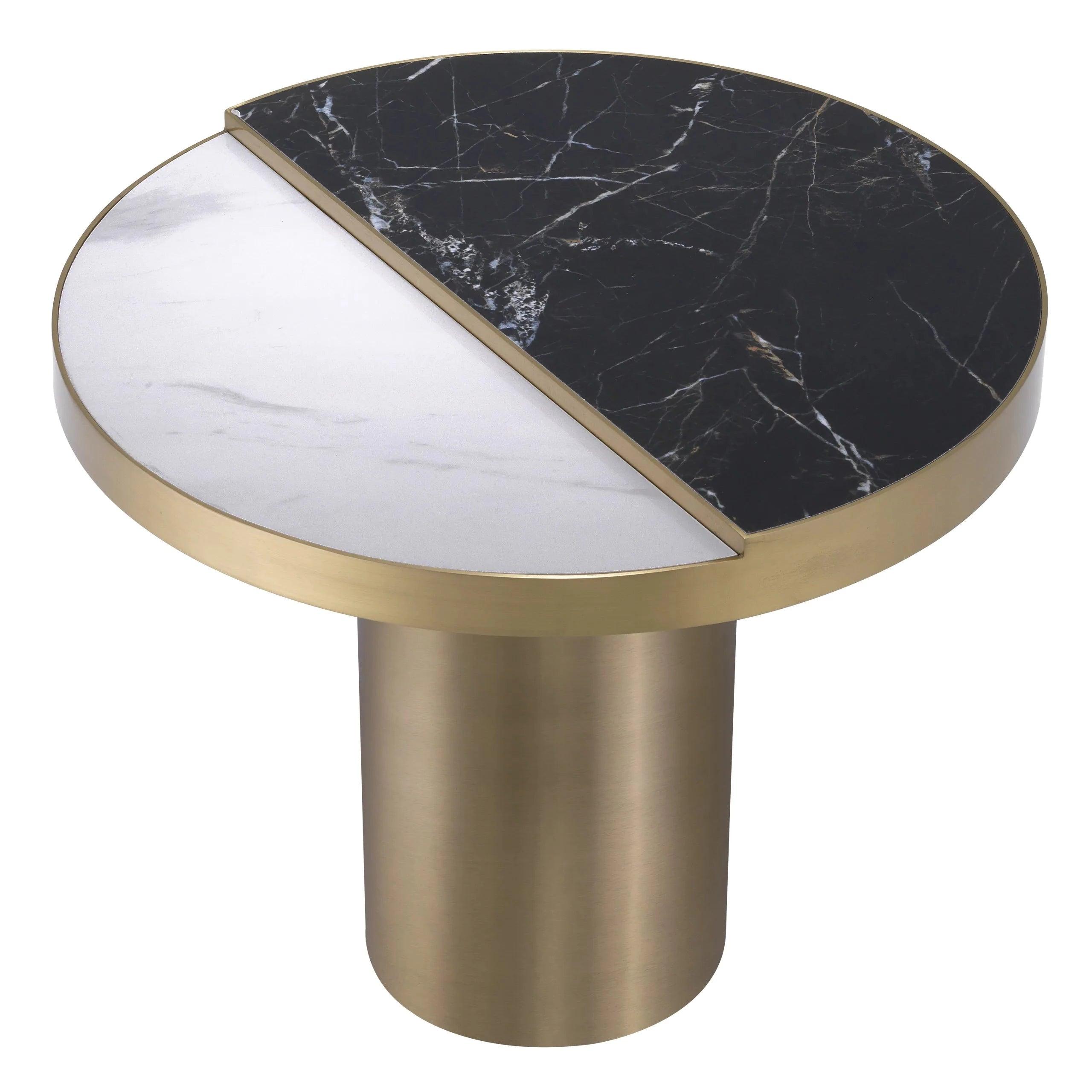 Seitentisch Excelsior ist die Quintessenz der Kunst in der Welt der Möbel. Die einzigartige Komposition von zwei halb gerunden Marmor -Arbeitsplatten schafft ein echtes Kunstwerk. Weißer Marmor harmonisch mit dem dominanten schwarzen Marmor kontrastiert, und die subtile Erhöhung der schwarzen Platte verleiht dem ganzen dynamischen Aussehen. Der Rahmen und der Rand des Tisches ergänzen dieses luxuriöse Design im Finish von gebürstetem Messing und verleihen ihm Wärme und Tiefe.