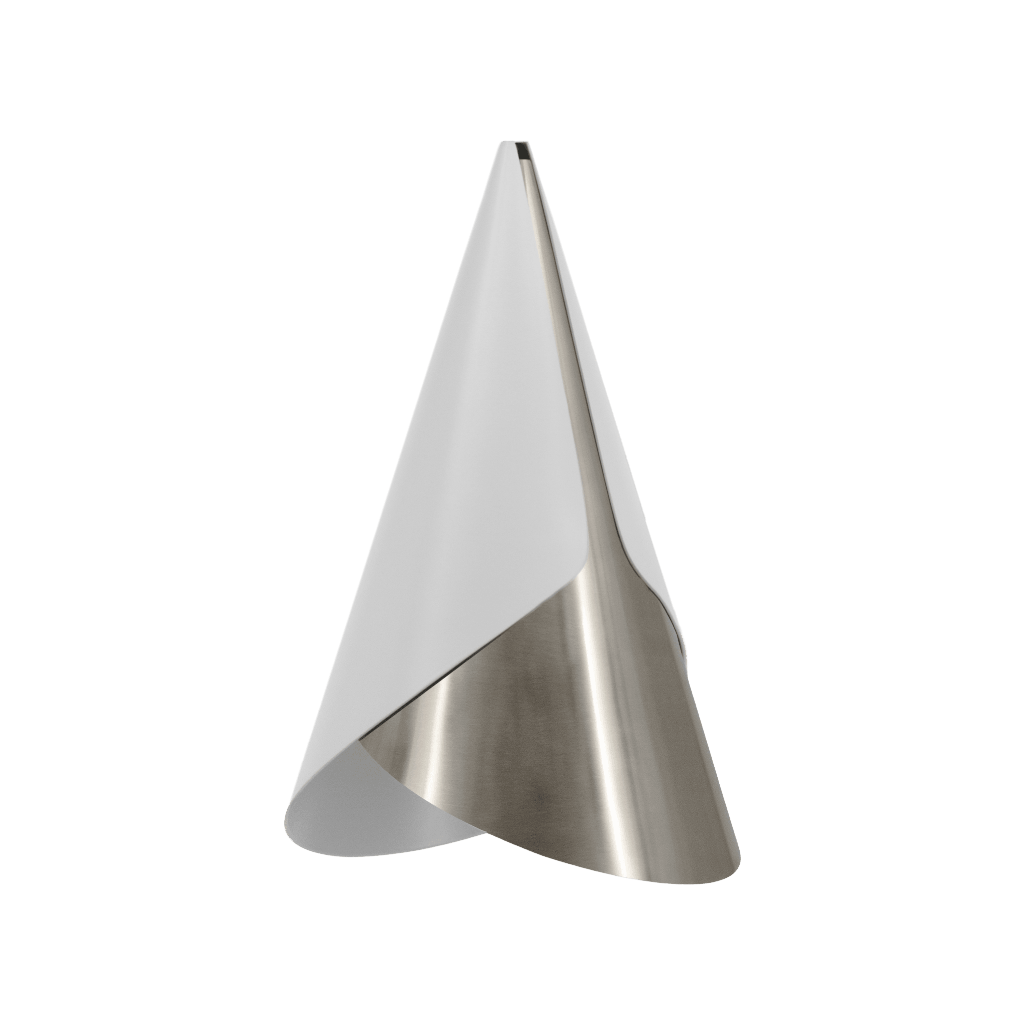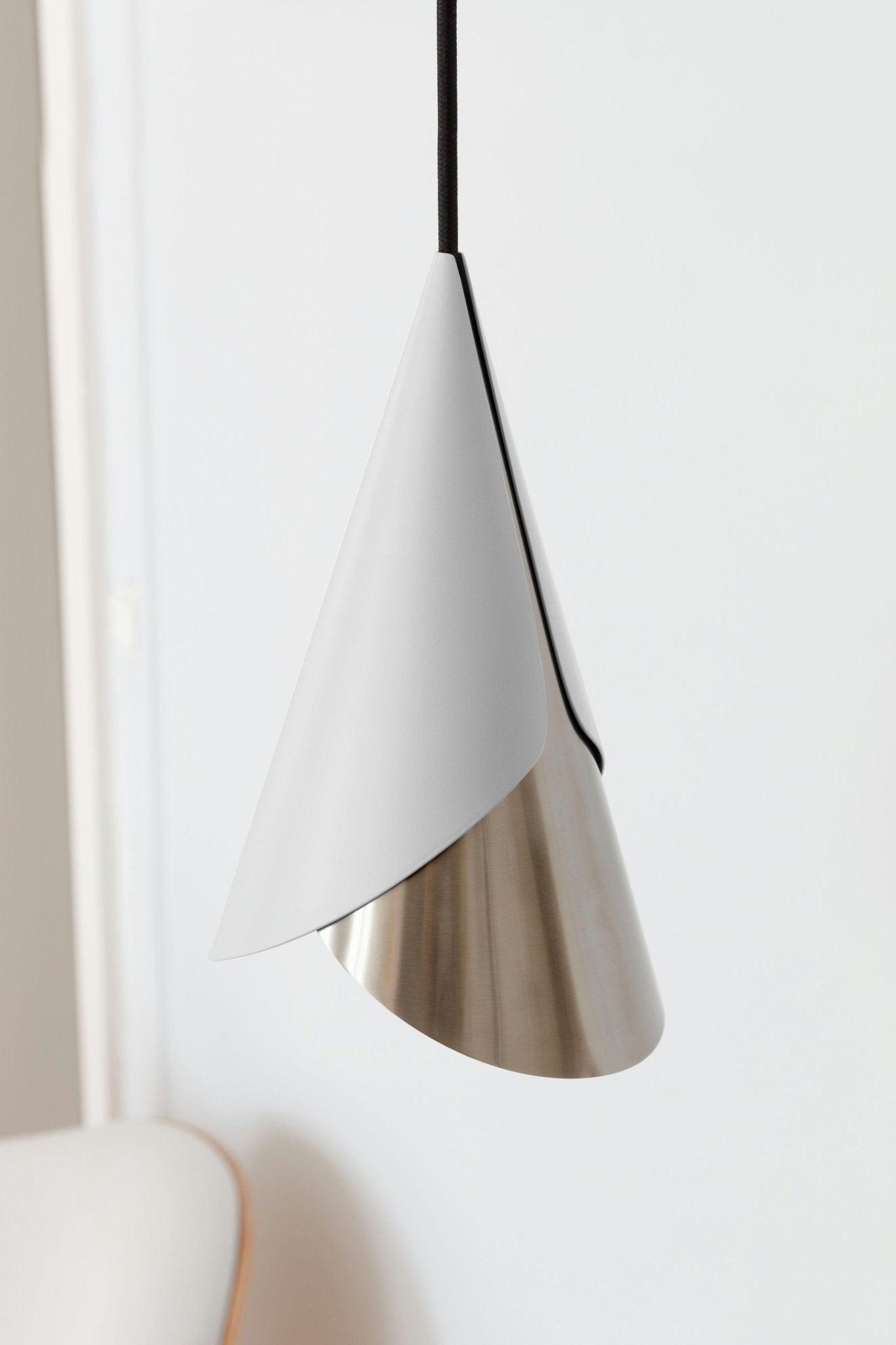 Kornett zu einzigartiger Lampenschirm, was Einfachheit und Funktionalität kombiniert und die Essenz der skandinavischen Eleganz verleiht. Es besteht aus zwei subtil geformten Metallkegeln, die an Stellen gedreht und umgewandelt werden können, wodurch Sie Licht und Erscheinungsbild für Ihre Vorlieben erzeugen können.