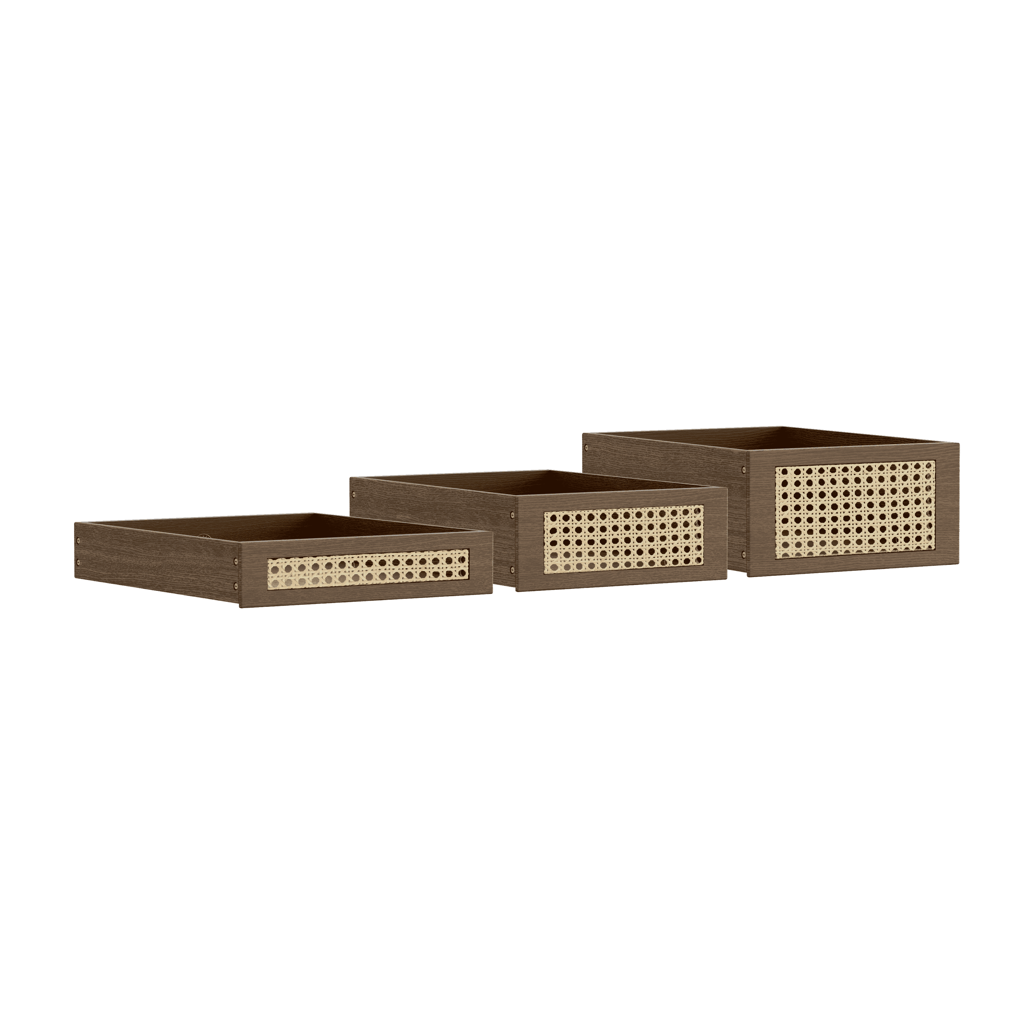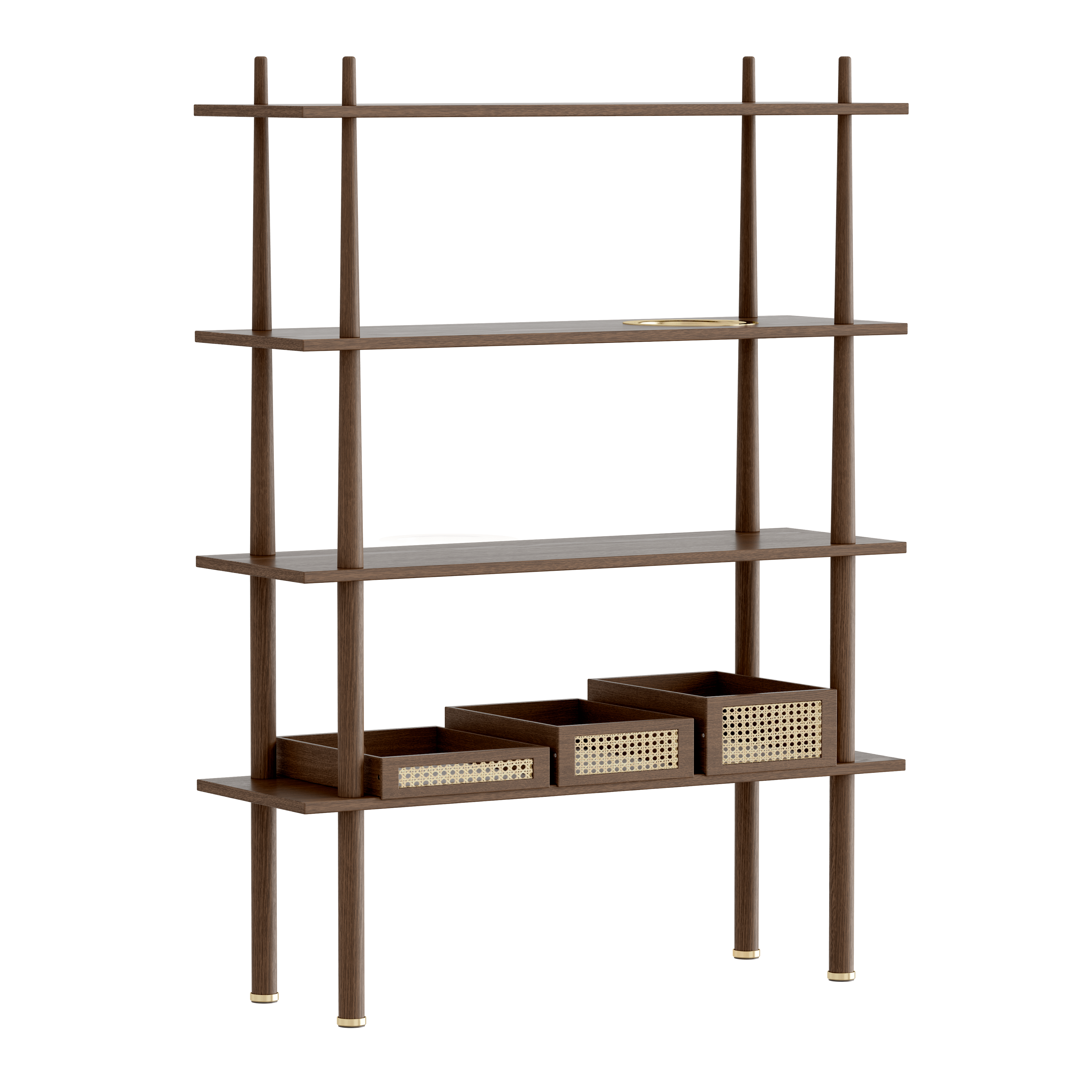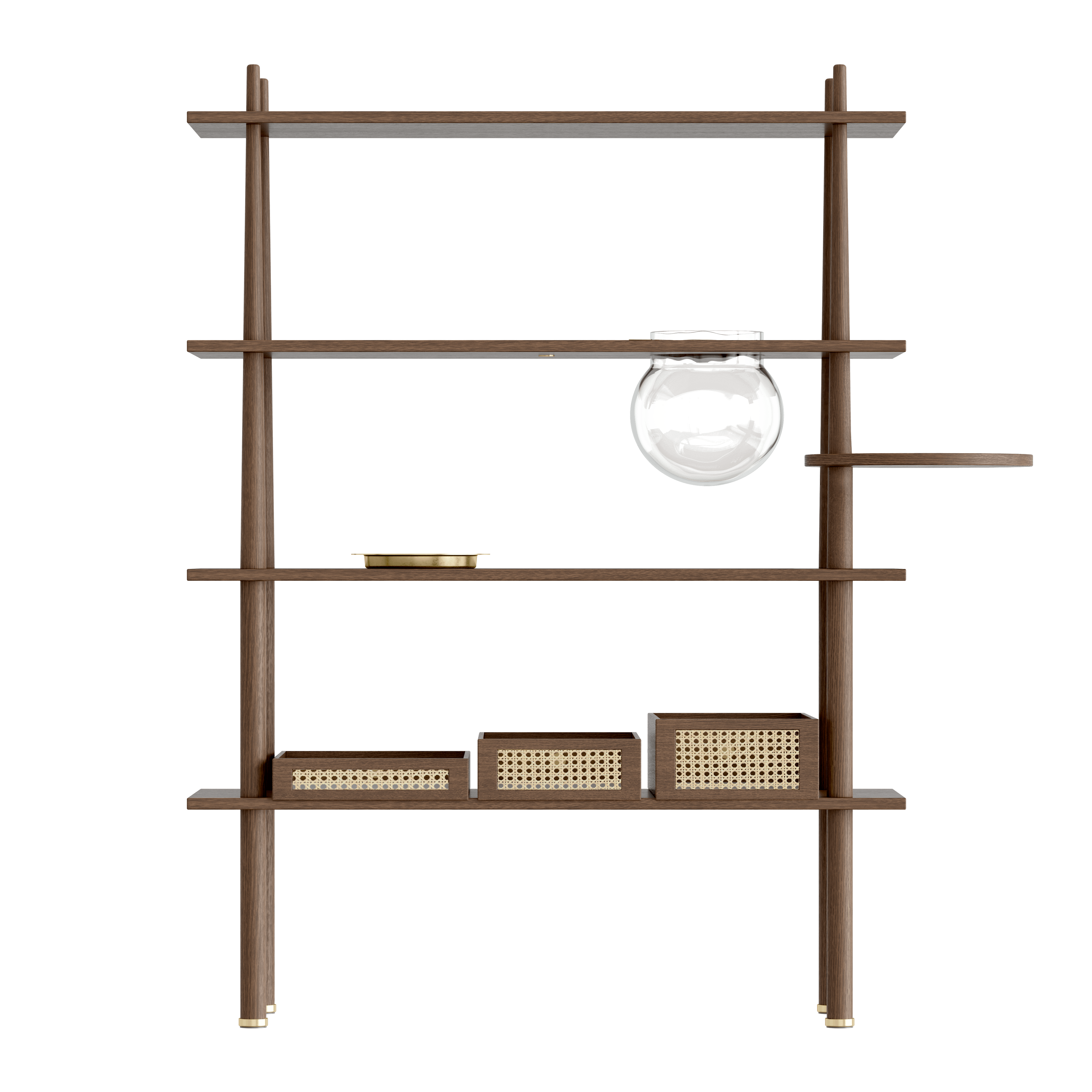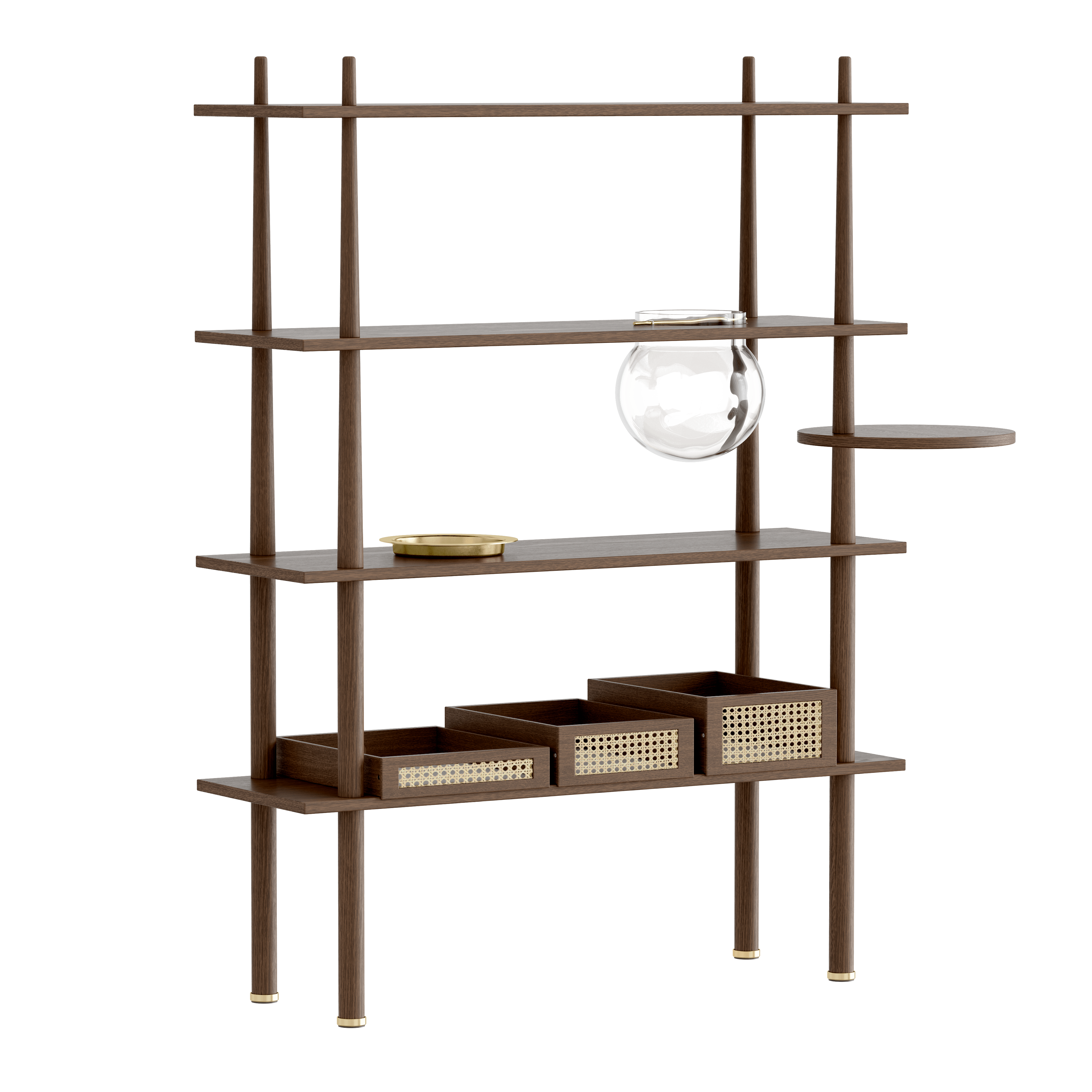 Geschichten an ästhetisch Gestell, Auf dem Sie das zeigen können, was Ihnen am besten gefällt und Ihre Lebensgeschichten teilen. Die Böden bestehen aus vier Regalen, von denen eines ein Loch mit einer Messingfliese für kleine kleine Dinge hat. Gestell Es ist auch mit drei Holzschalen mit einem vorderen Venezianischen Schilf ausgestattet, wodurch es einfacher ist, das Chaos zu verbergen. Geschichten können auf die notwendige Größe erweitert und mit mehreren Zubehör für Regale, einschließlich einer Glasschale, zusätzlichen Lagerregalen und einem Seitenregal personalisiert werden.