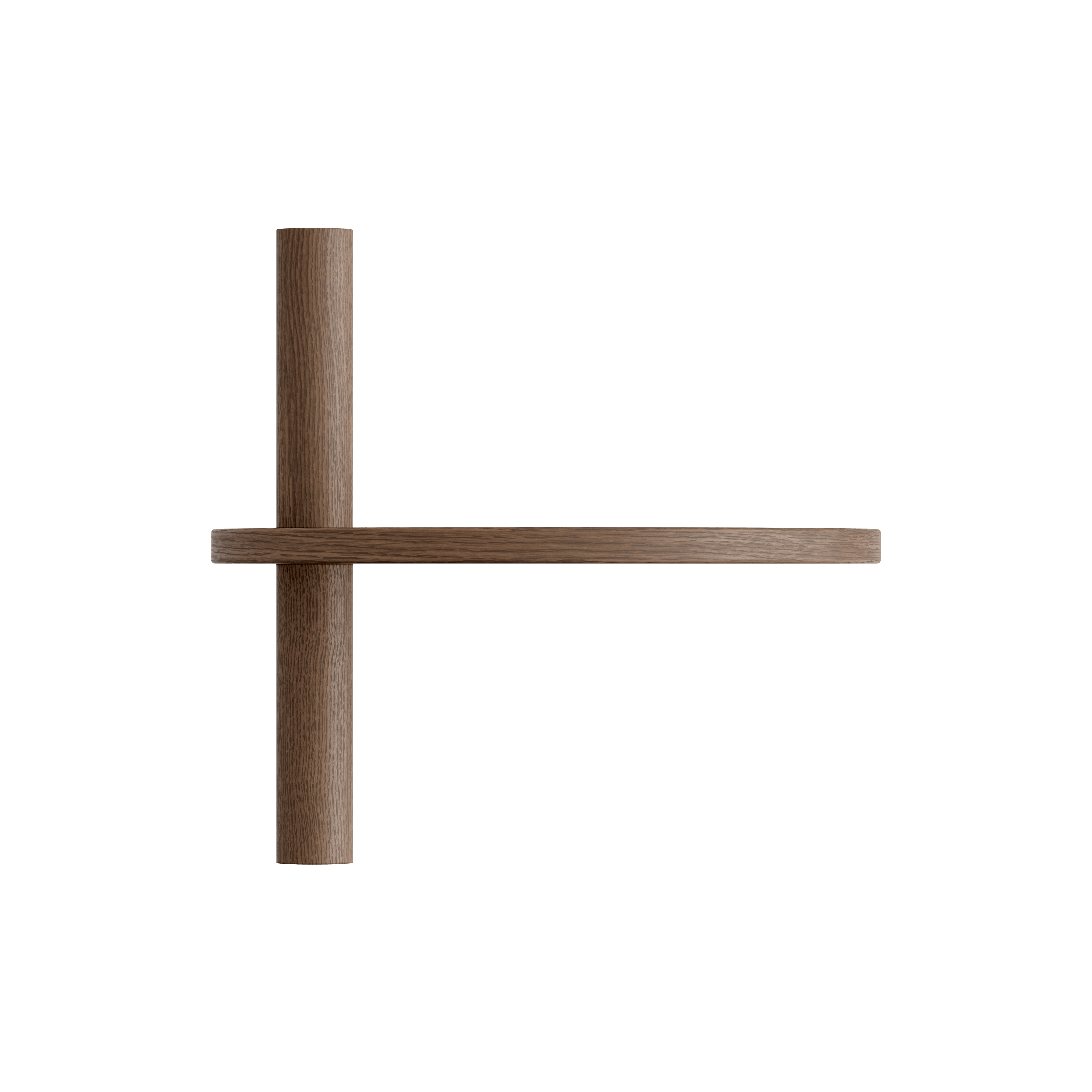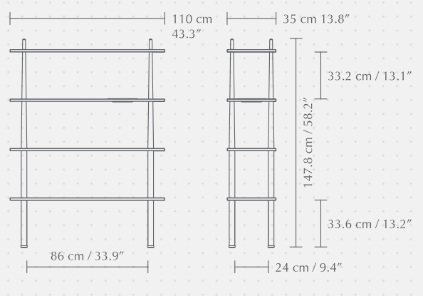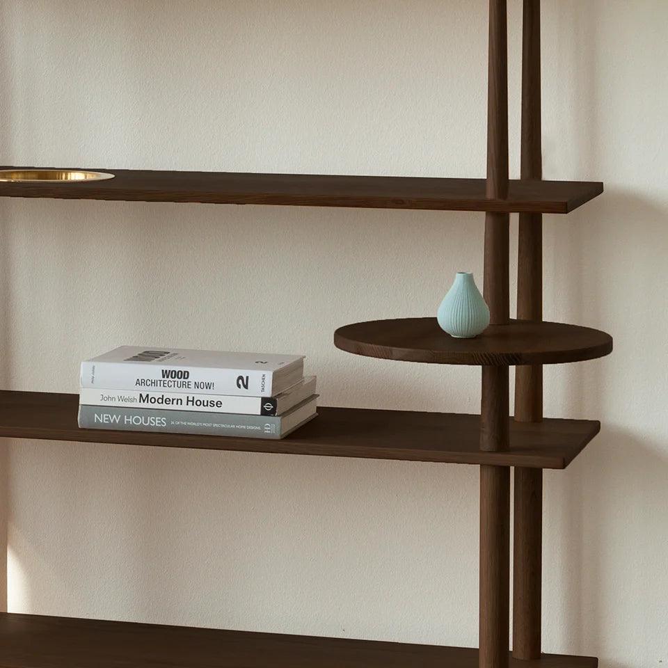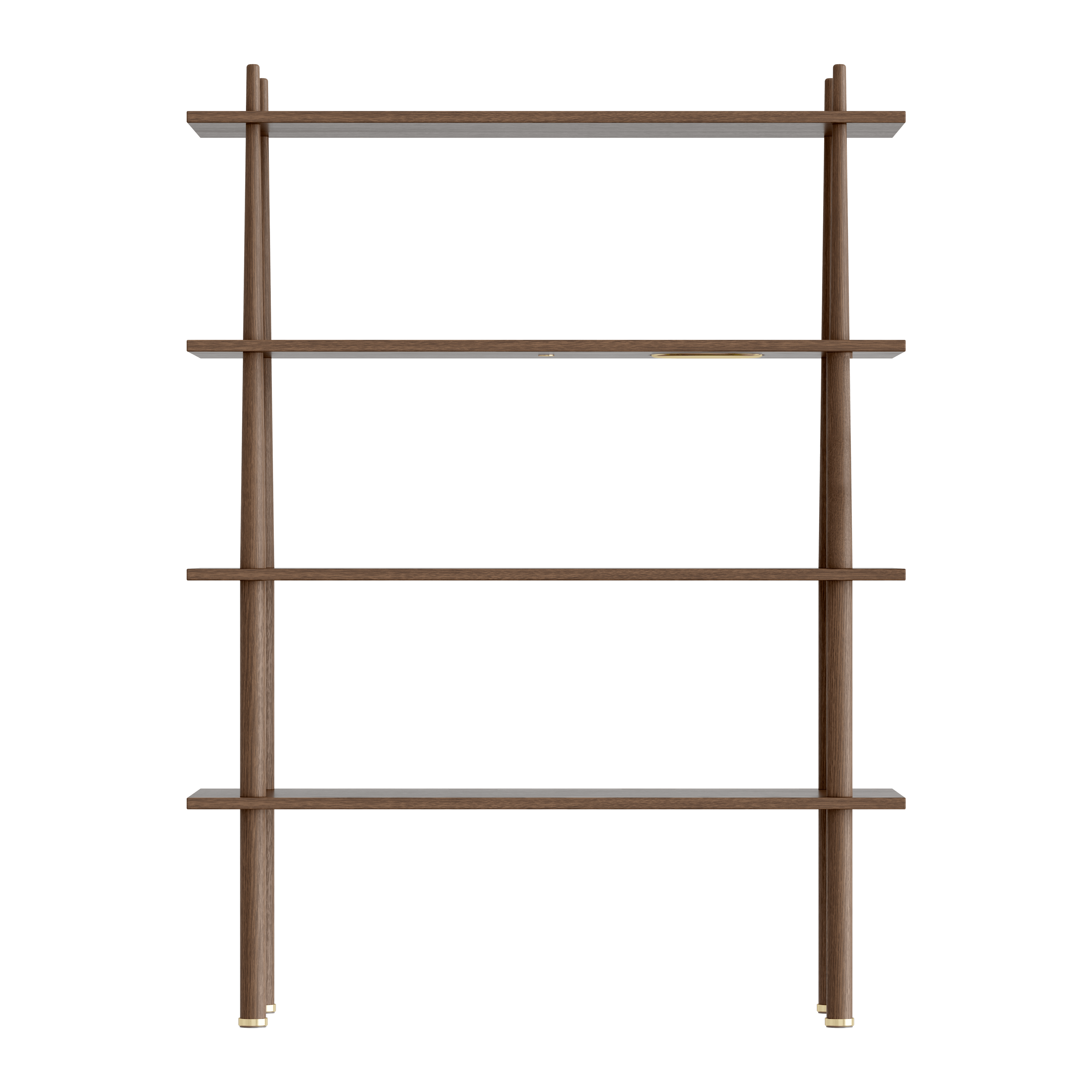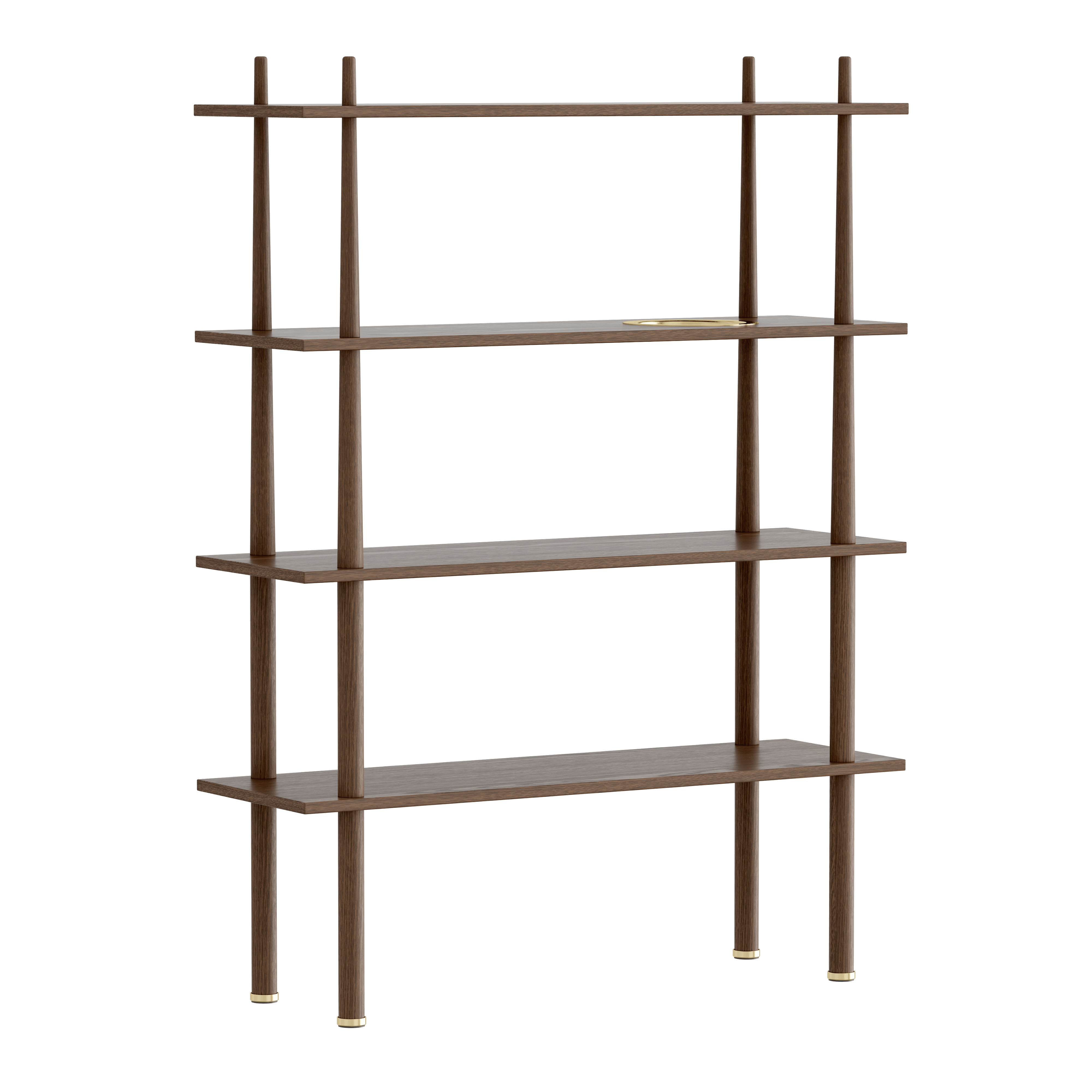 Geschichten bestanden aus Eiche und zeichnet sich dank von vier konischen Beinen durch visuelle Einfachheit aus, die ihm ein agiles und zartes Aussehen verleihen. Das Rack -System ist mit vier Messingbeinen ausgestattet, die an abfallende Fußböden eingestellt und geeignet werden können, die für alte Wohnungen in Kopenhagen typisch sind.