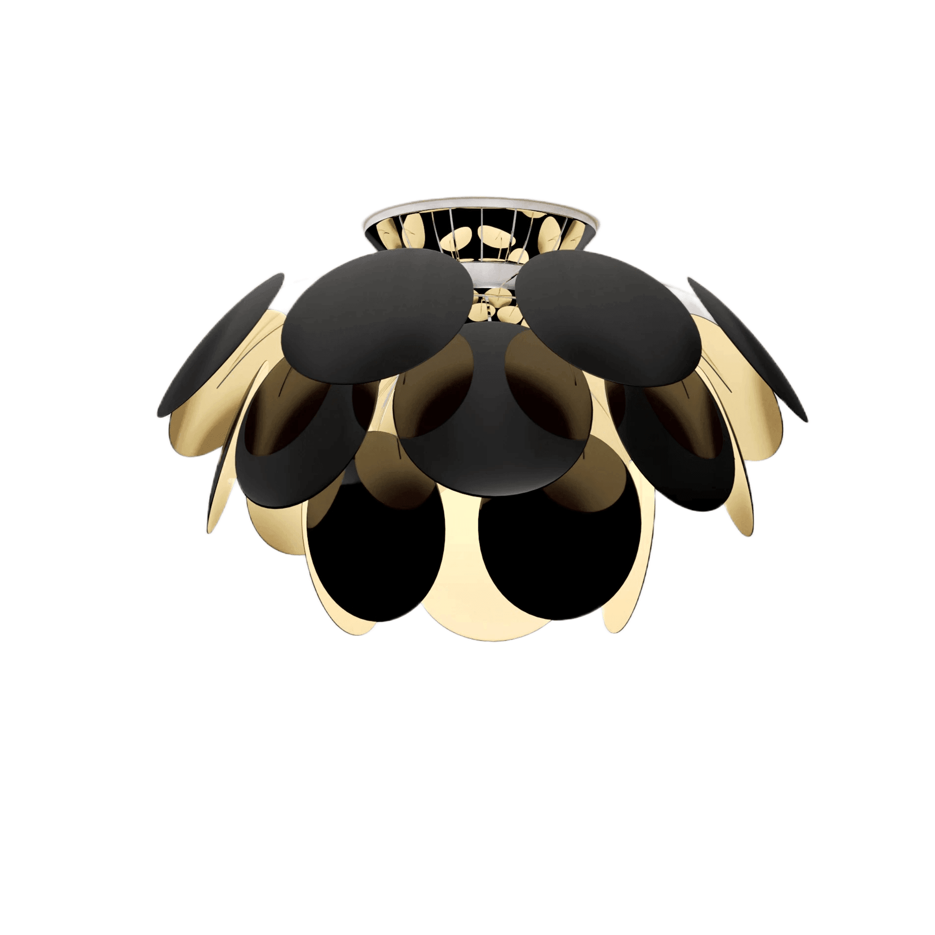 Zusätzliche Reflexionen spiegeln sich aus der Chrom -Hemisphäre wider, an die die Scheiben befestigt sind. Nach dem Ausschalten von Discocó ist ein atemberaubendes Objekt, das das Auge auffällt und den Raum füllt. Erhältlich in Weiß und Goldschwarz in 2 verschiedenen Größen.