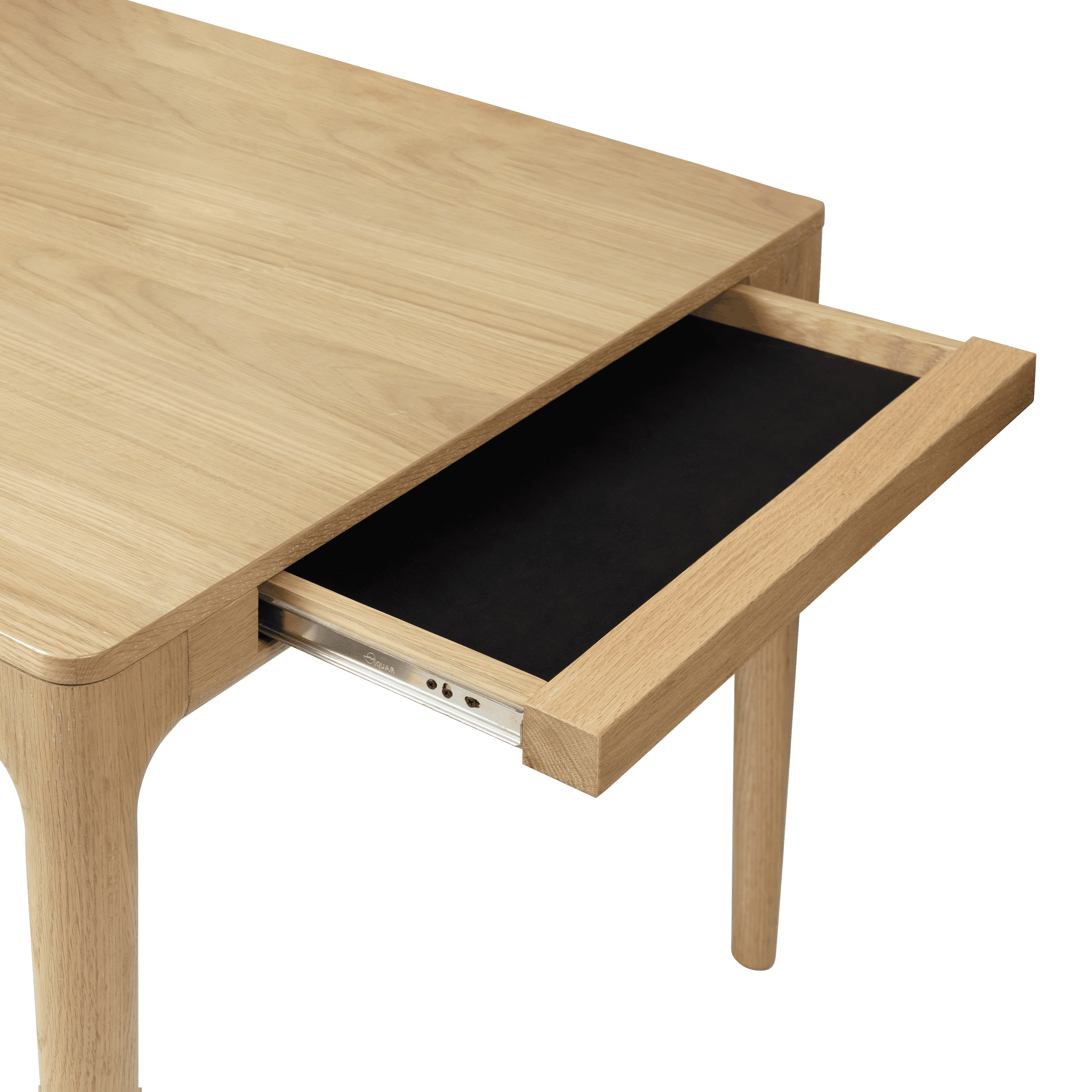 Beide Enden der Tabelle verbergen zwei mit zarten Stoff gepolsterte Schubladen, sodass Sie schnell alle Störungen und Spuren verbergen können, was manchmal den Alltag zurückbleibt. Diese beiden Schubladen fungieren auch als Griffe für zwei verlängerte Platten, um die Tischstabilität auch nach ihrer Entwicklung zu gewährleisten. Die Verlängerungsplatten sind am Tisch diskret versteckt und können je nach Ihren Anforderungen leicht hinzugefügt oder entfernt werden.