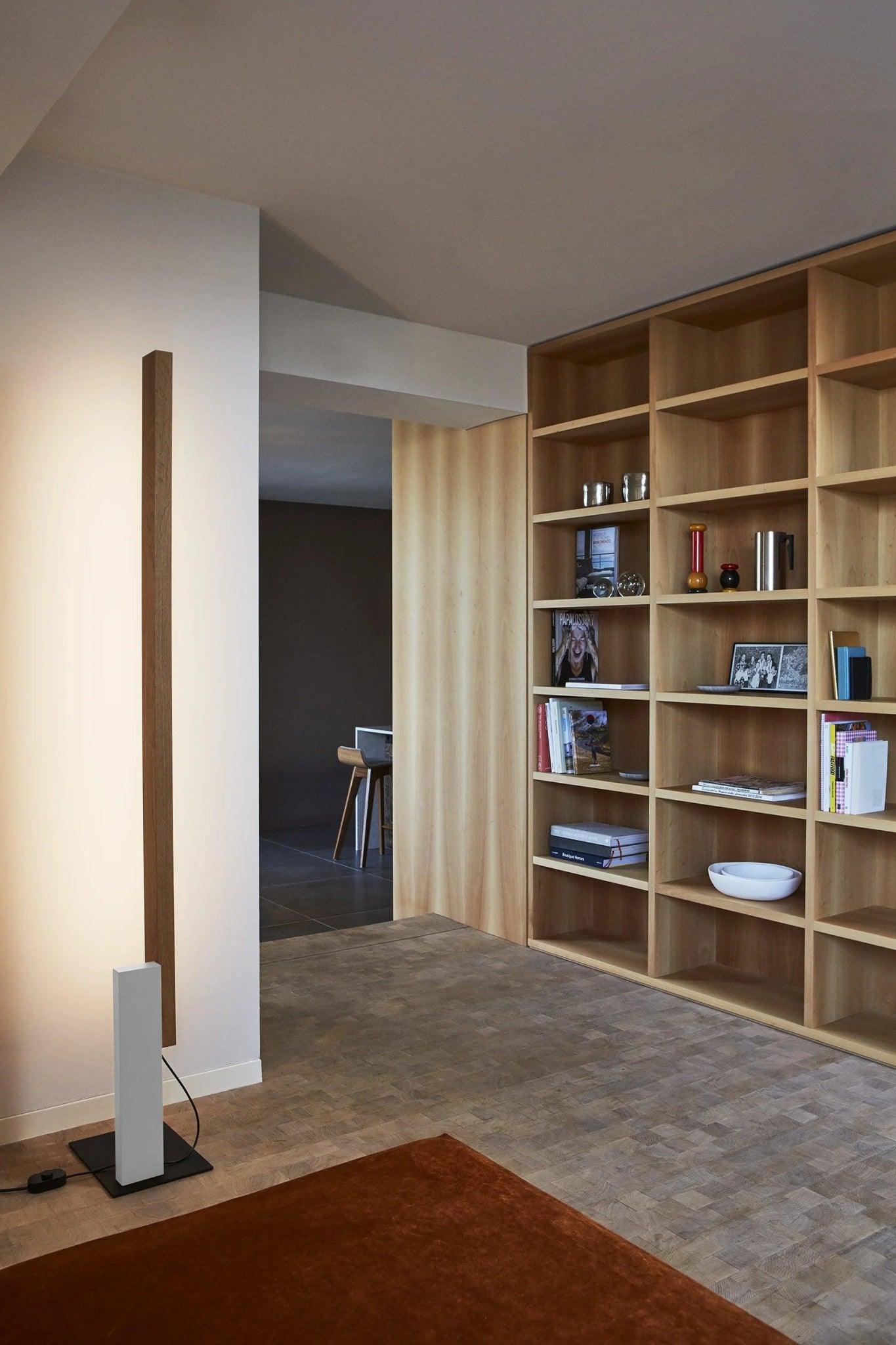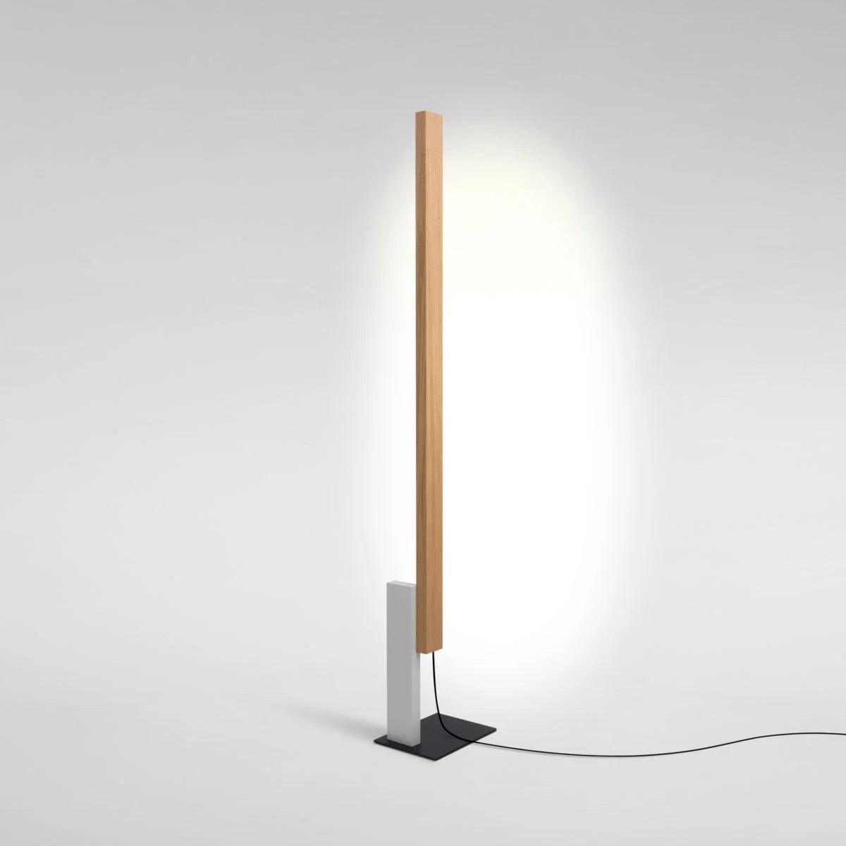 Formal handelt es sich um eine Komposition von Volumen und Farben. Drei Blöcke, die sich durch ihre Formen und Schattierungen unterscheiden: vertikales, leichtes Übertragungselement von Eichen oder Wenge wird an einem Block aus lackiertem Holz befestigt. Beide steigen über der schwarzen Basis, die den optimalen Abstand bestimmt, in dem die Lampe von der Wand platziert werden sollte, um die perfekte Lichtquelle zu erzeugen. Die Schwere der Formen steht im Gegensatz zur Holzwärme und der Farbtiefe.