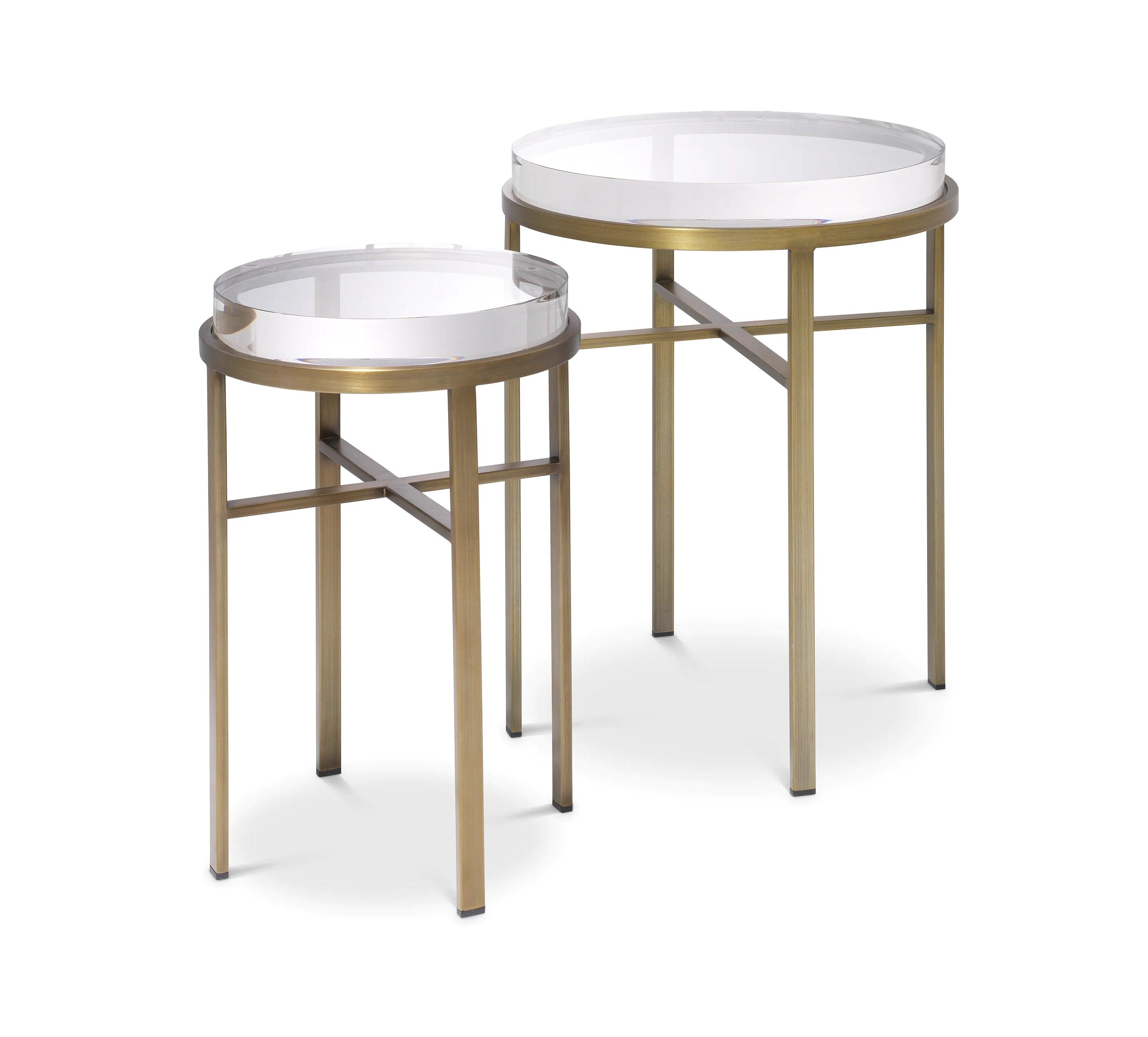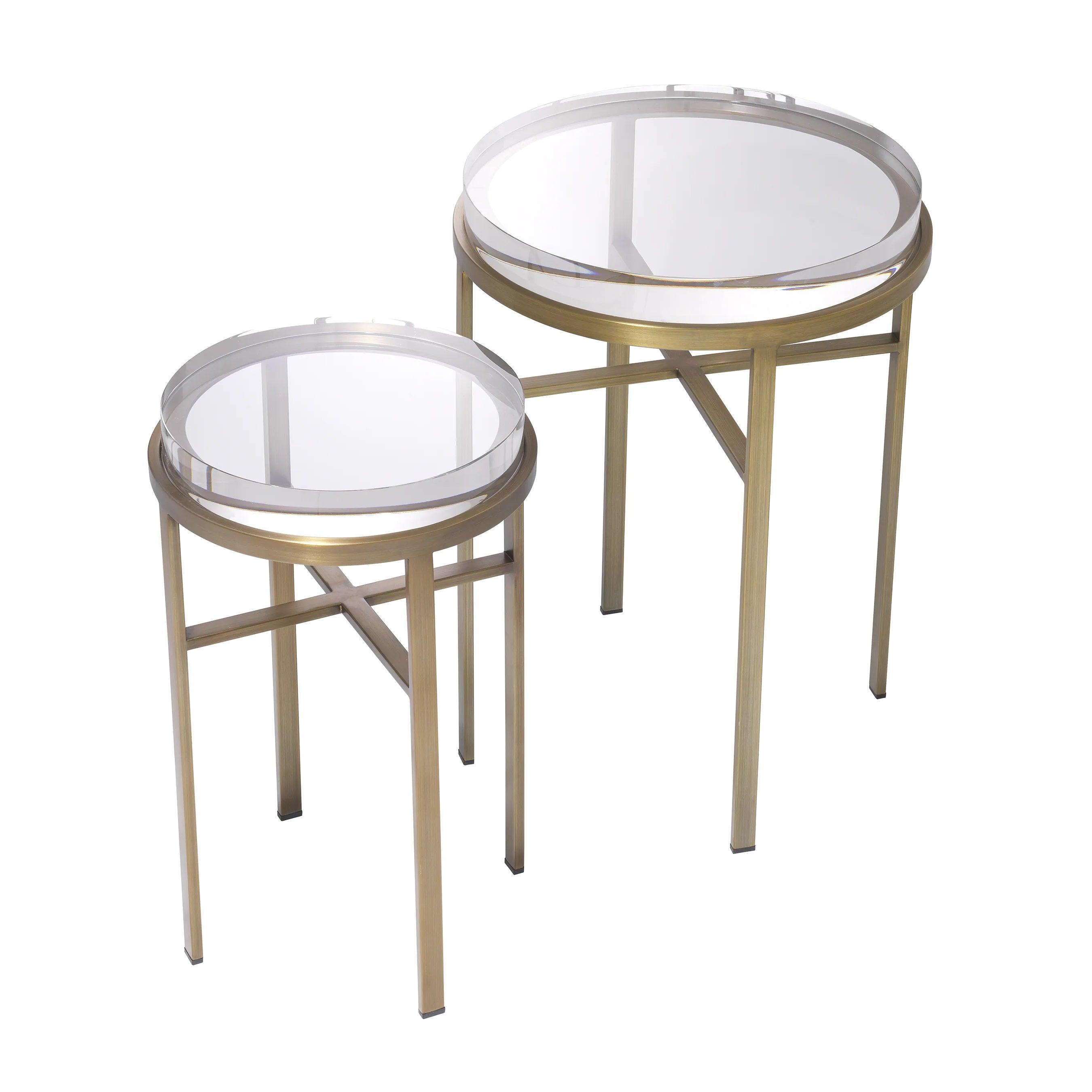Entdecken Sie Eleganz in Einfachheit mit Ein Satz von Seitentischen Hoxton. Zwei Tabellen, die sich in der Höhe unterscheiden, aber perfekt zusammenpassen, erzeugen eine Kombination aus Funktionen und Stil. Messing, schlanke Tischebeine, künstlerisch gekreuzt, erzeugen eine feste Basis für dicke Spitzen aus transparentem Glas, die in der Luft zu heben scheinen. Ist es Magie oder Handwerk? Man könnte beides sagen.