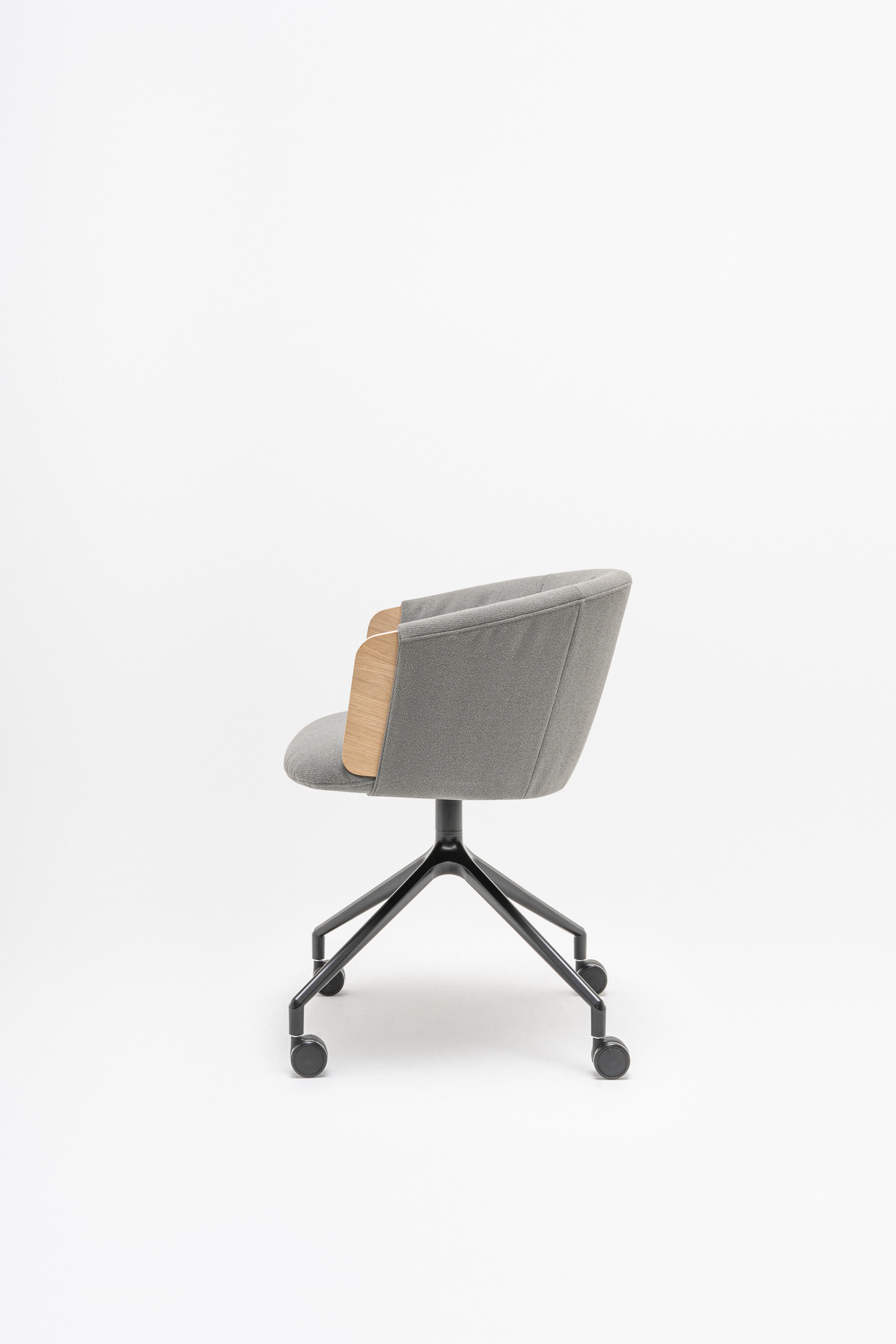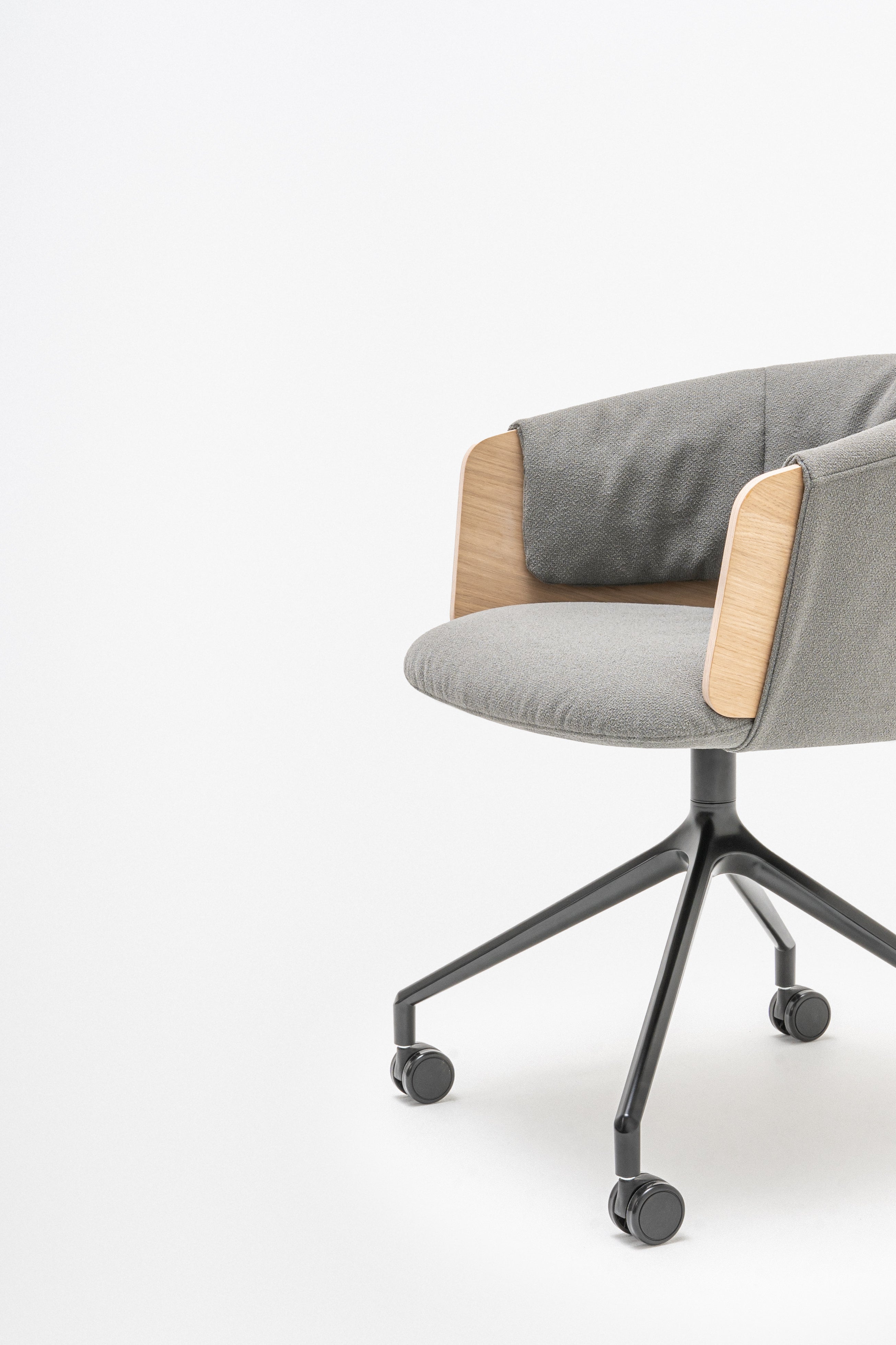 Drehstuhl Kragen mit einer Metallbasis auf Rädern bis hin zu weichen Oberflächen ist eine Kombination aus Eleganz und Funktionalität, ideal für Büros und Konferenzräume. Der gepolsterte Sitz und die Sperrholzunterstützung sorgen für Komfort, und das charakteristische gekräuselte Kissen verleiht einen stilvollen Akzent. Die Metallbasis auf Rädern, die an weiche Oberflächen angepasst sind, garantiert auch auf Teppichen Mobilität und einfache Bewegung.