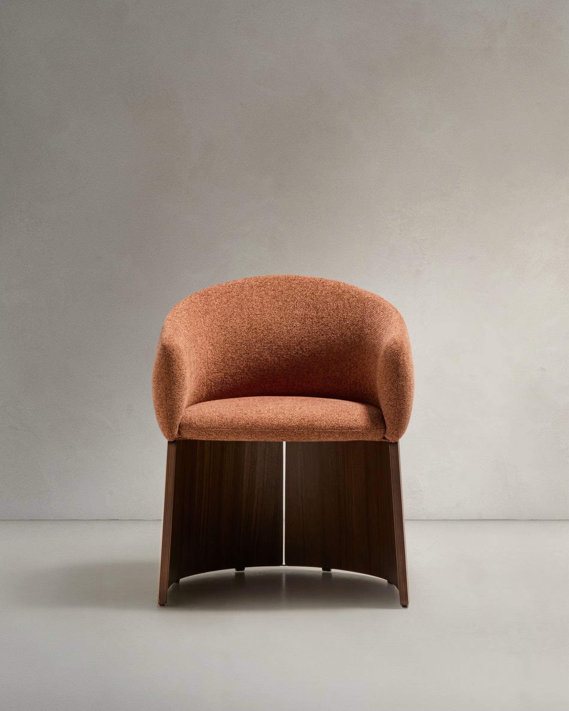 Stuhl BOSCA ziegelroter Chenille mit einer Basis aus Nussbaumfurnier