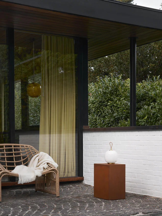 Tragbare Lampe VL 45 ist eine moderne Interpretation des klassischen Designs von Vilhelma Lauritzena aus den 40er Jahren, das ursprünglich für das Gebäude des dänischen Rundfunks Radiohuset in Kopenhagen entworfen wurde. Die zeitgenössische tragbare Version bewahrt das elegante, zeitlose Aussehen des Originals und bietet gleichzeitig die Freiheit der Nutzung – sowohl drinnen als auch draußen. Hergestellt aus handgeblasenem opalem Glas und veredelt mit Details aus Messing und natürlichem Leder, tragbare Lampe VL 45 verbindet traditionelles Handwerk mit moderner Technologie.