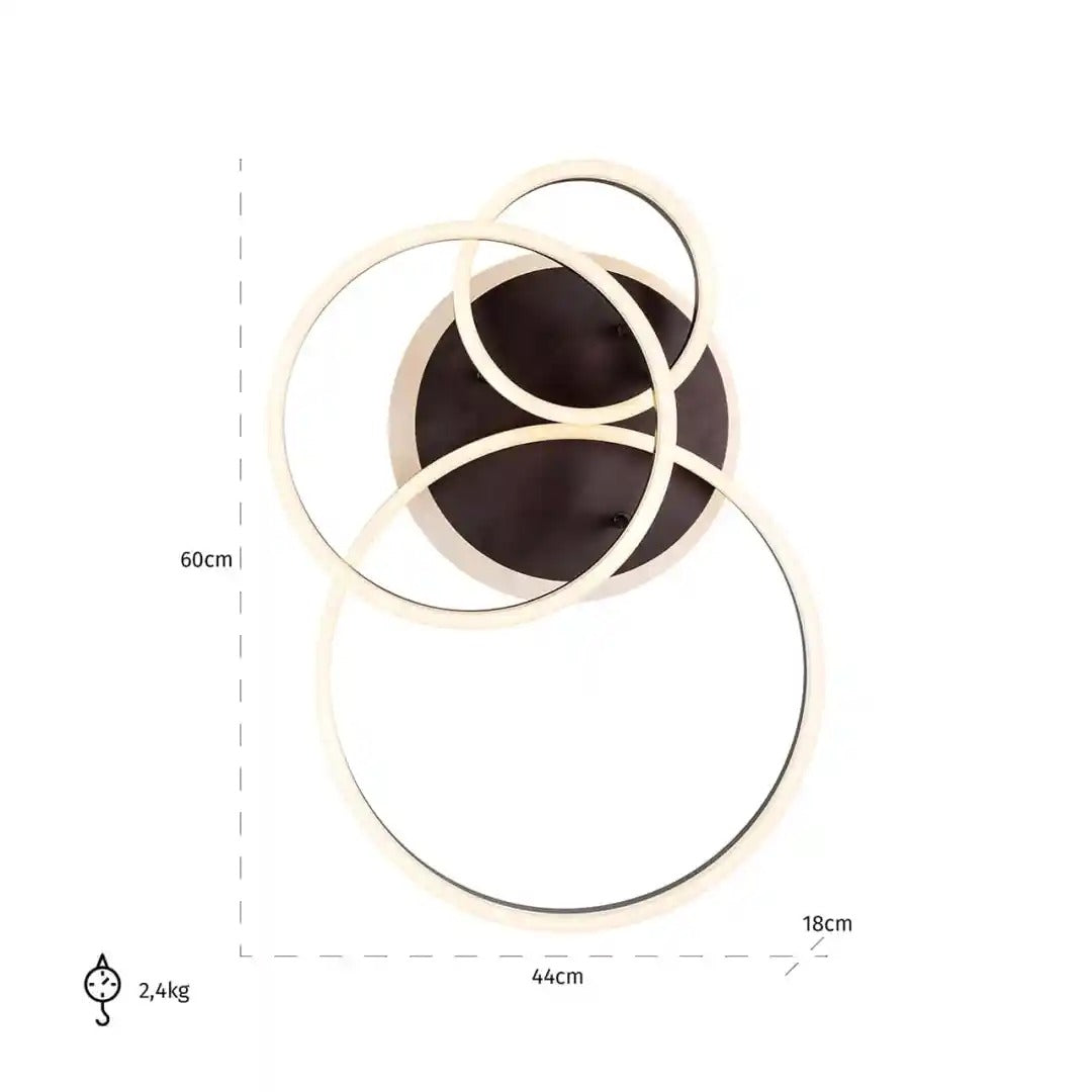 Moderne Deckenlampe Mosa ist ein Designer-Beleuchtungsvorschlag, der Eleganz mit Funktionalität verbindet. Die einzigartige Form, die auf sich überschneidenden Kreisen basiert, macht die Lampe nicht nur zu einer Lichtquelle, sondern auch zu einer beeindruckenden Wanddekoration. Das subtile LED-Licht schafft eine gemütliche Atmosphäre, ideal für das Wohnzimmer, das Schlafzimmer oder den Büroraum.