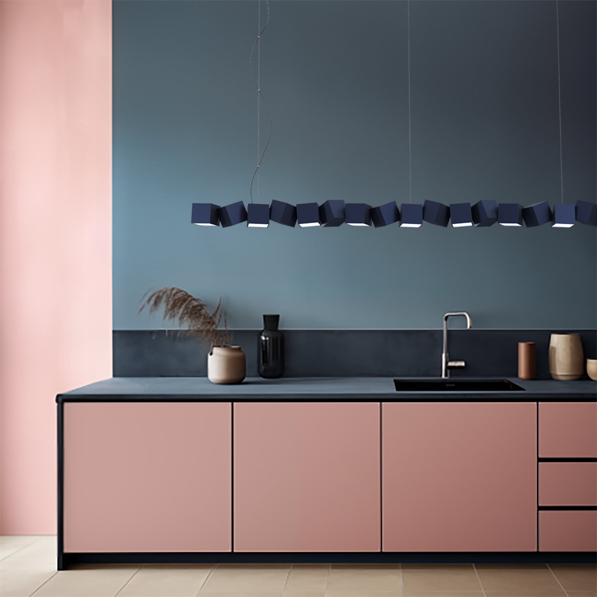 Die Pendelleuchte Blockchain ist eine moderne, skulpturale Form der Beleuchtung, die künstlerischen Ausdruck mit präziser Ingenieurskunst verbindet. Sie besteht aus Aluminiumwürfeln, die scheinbar zufällig angeordnet sind und eine dynamische Komposition aus Licht und Schatten schaffen. Jedes zweite Modul ist beleuchtet, wodurch diese moderne LED-Pendelleuchte gleichmäßiges, sanftes Licht nach unten abstrahlt. Das außergewöhnliche Design macht die Pendelleuchte aus Aluminium Blockchain nicht nur zu einer Lichtquelle, sondern auch zu einer beeindruckenden Dekoration des Raumes.