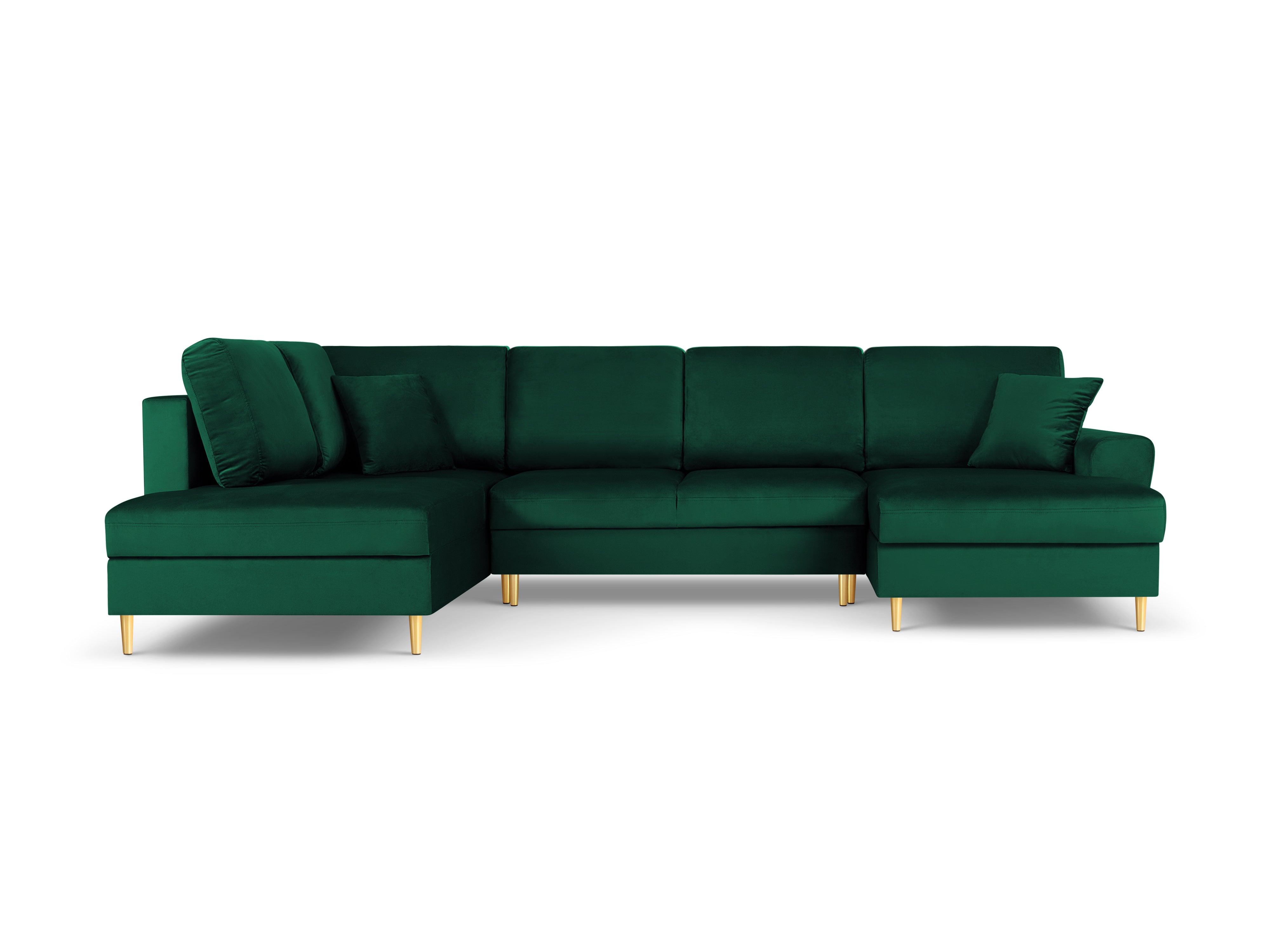 Narożnik lewostronny aksamitny panoramiczny z funkcją spania KYOTO butelkowa zieleń ze złotą podstawą Cosmopolitan Design    Eye on Design