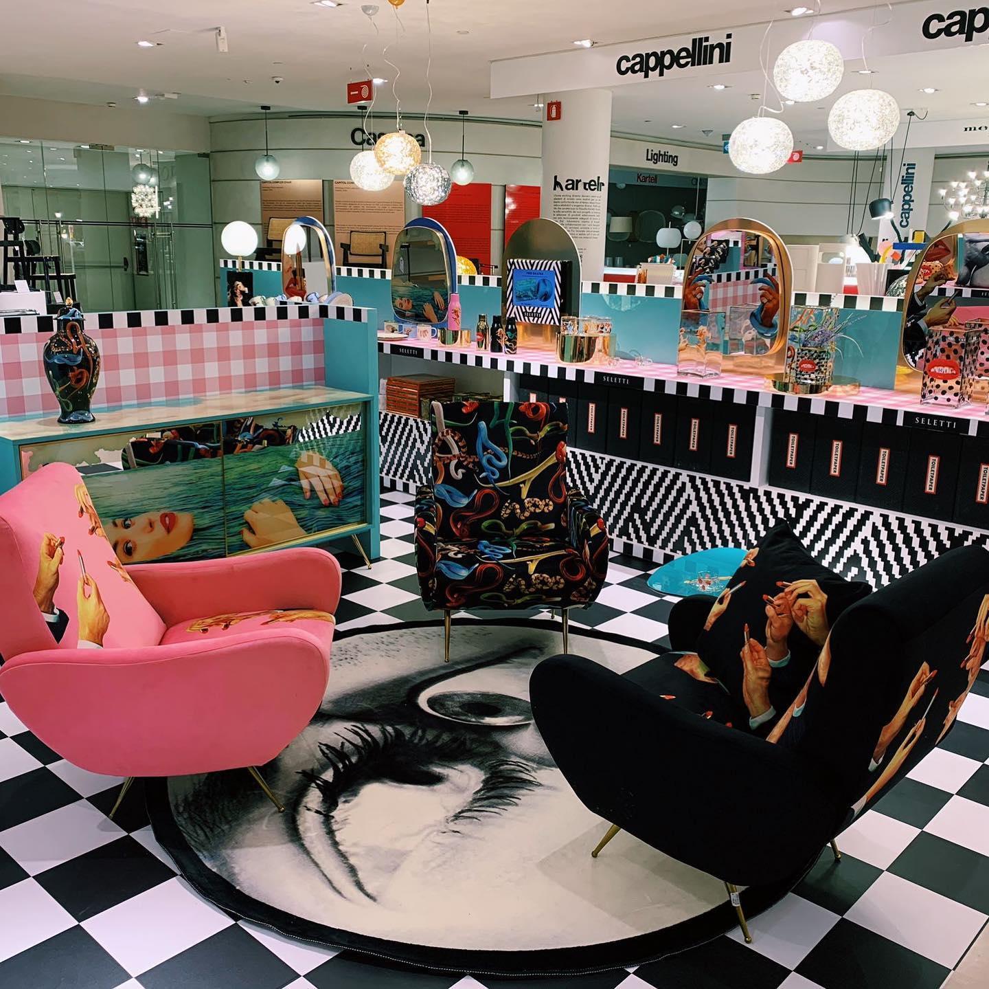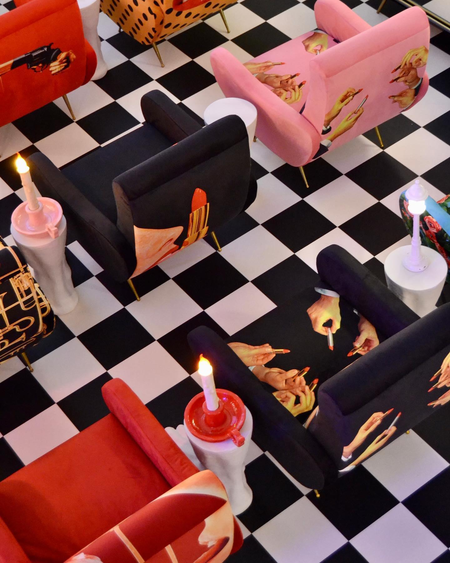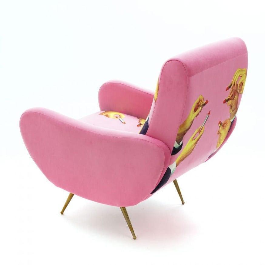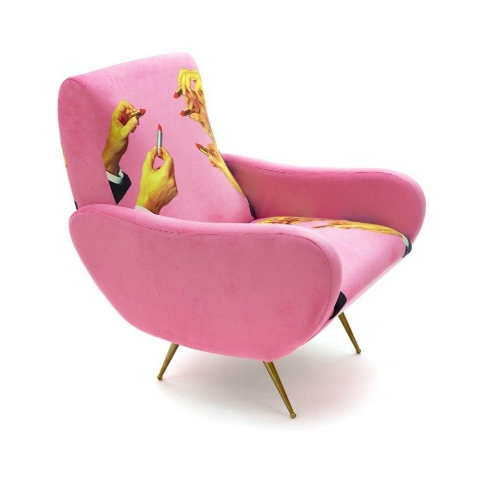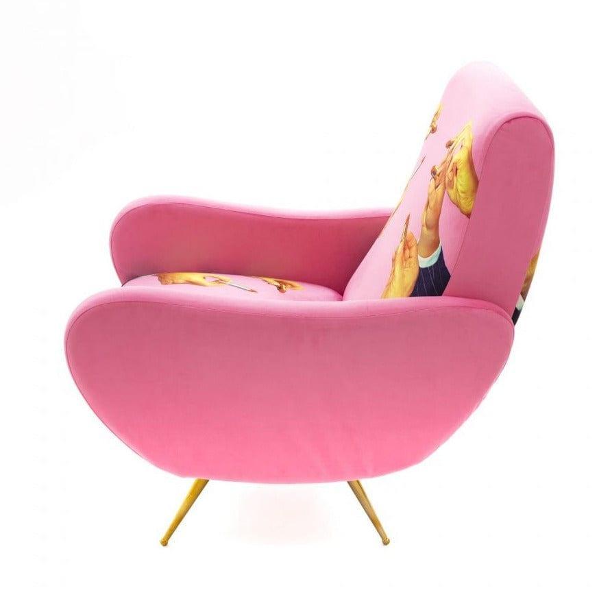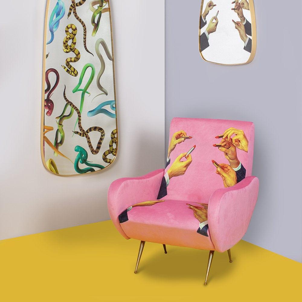 Designer -Sessel Im Stil der 1950er Jahre Aus dem italienischen König der Avant -Gartre - Seletti, der wie ein Tor zu einer anderen surrealen Dimension dem Innenraum einen einzigartigen Charakter verleiht. Polsterung mit ausdrucksstarker, dynamischer Farben und einer leicht kontroversen Collage erzeugen ein originelles Kunstwerk.