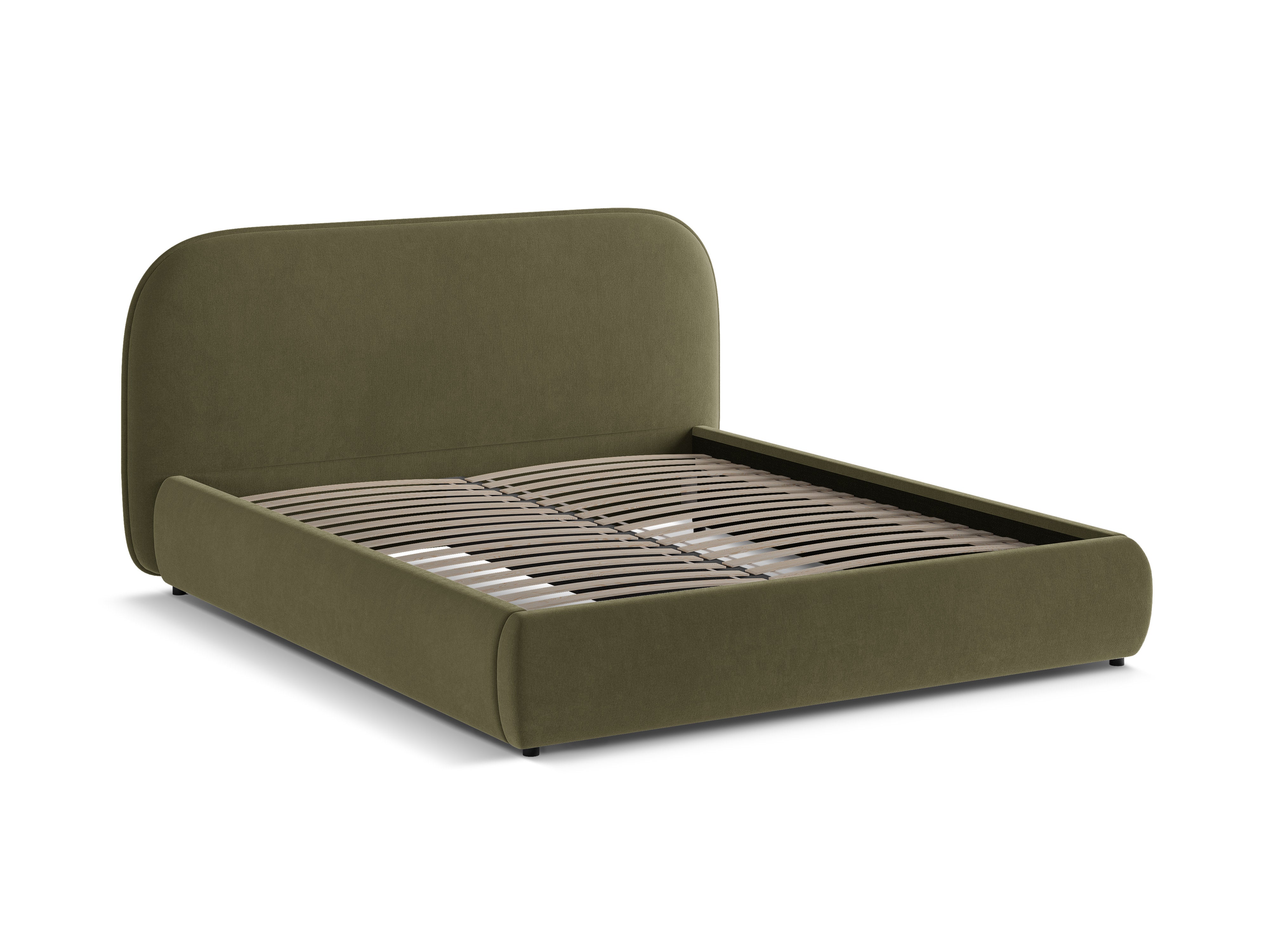 Łóżko Murada wyróżnia się miękką, obłą formą oraz zaokrąglonym wezgłowiem, które zapewnia wygodne podparcie podczas odpoczynku i wprowadza do wnętrza spokojny, harmonijny klimat. Stabilna konstrukcja oparta na stelażu z drewnianych listew poprawia komfort snu i wentylację materaca. Subtelna lamówka wokół zagłówka podkreśla staranne wykończenie i elegancki charakter mebla. Model dostępny w różnych szerokościach, co pozwala dopasować go do przestrzeni. Produkt sprzedawany bez materaca, pościeli i dekoracji.