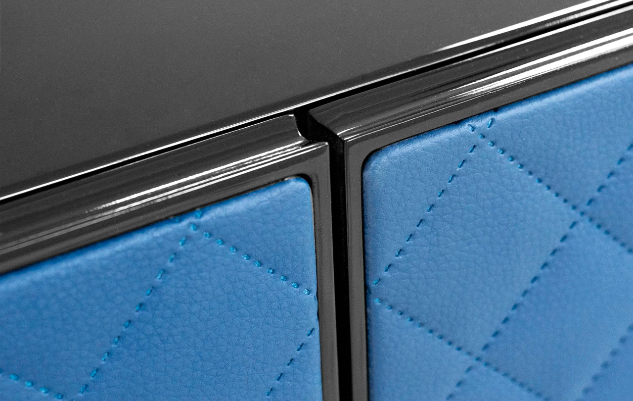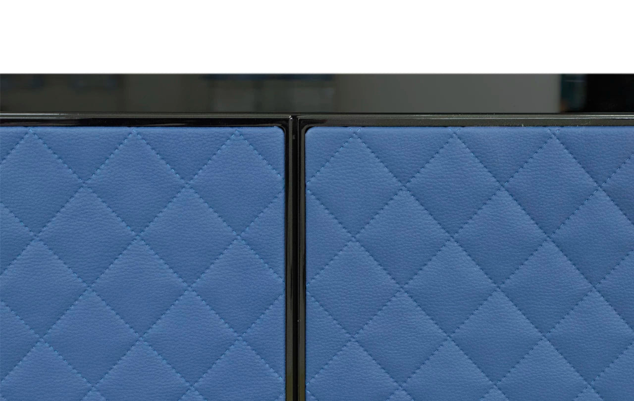 Kommode Melodien in einem dunkelblauen Eco -Leder -Farbton sind ein extrem elegantes Möbelstück, das nicht nur durch einzigartiges Design, sondern auch mit hoher Verarbeitungsqualität auszeichnet. Die drei Fronten, die mit einer dunkelblauen Ecosha bedeckt sind, erlangen dank der gemahlenen und lackierten Kante einen zusätzlichen Effekt, der ihnen einen subtilen, ästhetischen Charakter verleiht.