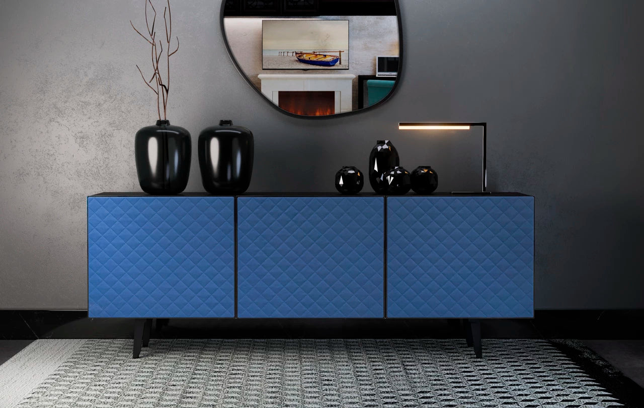 Innovatives Eröffnungssystem Marineblaue Kommode Durch die Verwendung von Push-Clicks wird die Verwendung dieser Möbel extrem bequem und intuitiv verwendet. Darüber hinaus wurde der Körper der Kommode in einem Winkel von 45 Grad geklebt, was nicht nur die Sorgfalt der Leistung hervorhebt, sondern den Möbeln auch ein modernes Design verleiht.