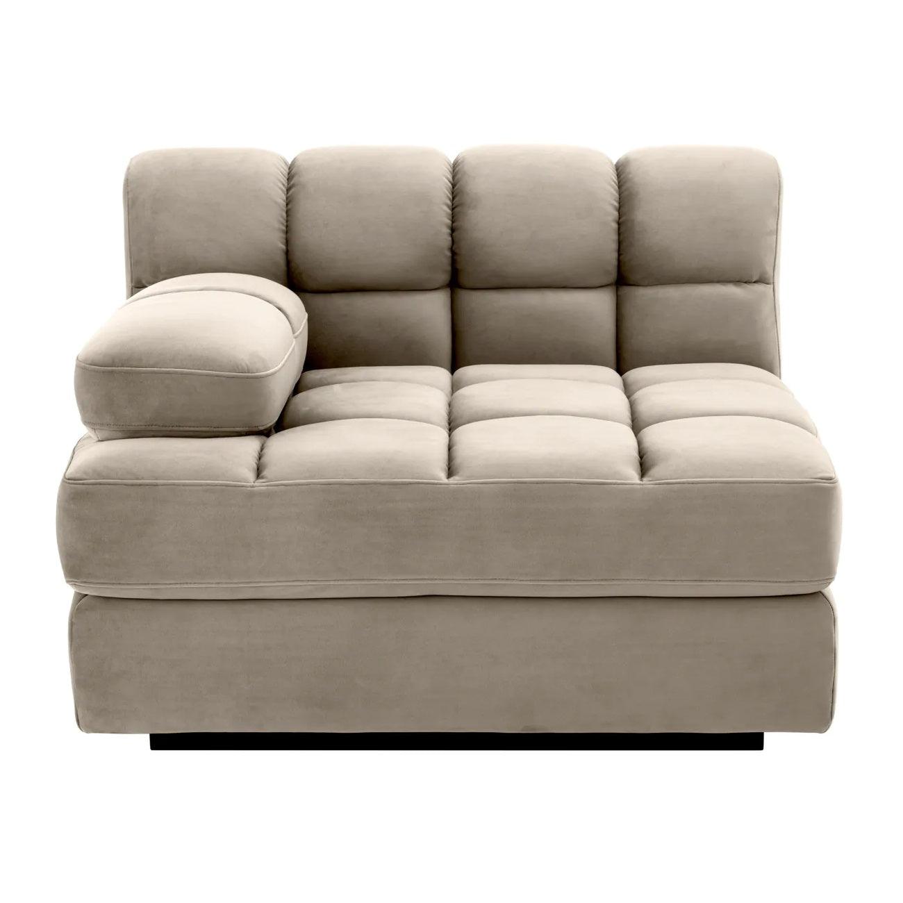 Dieses beige Element sieht dank seines Samtes nicht nur luxuriös aus, sondern bietet auch außergewöhnlichen Komfort. Die Samtpolsterung verleiht dem Eckelement einen eleganten Look, der sowohl modernen als auch klassischen Innenräumen entspricht. Die schwarze Basis fügt Kontrast und Stil hinzu und betont ihren modernen Charakter.