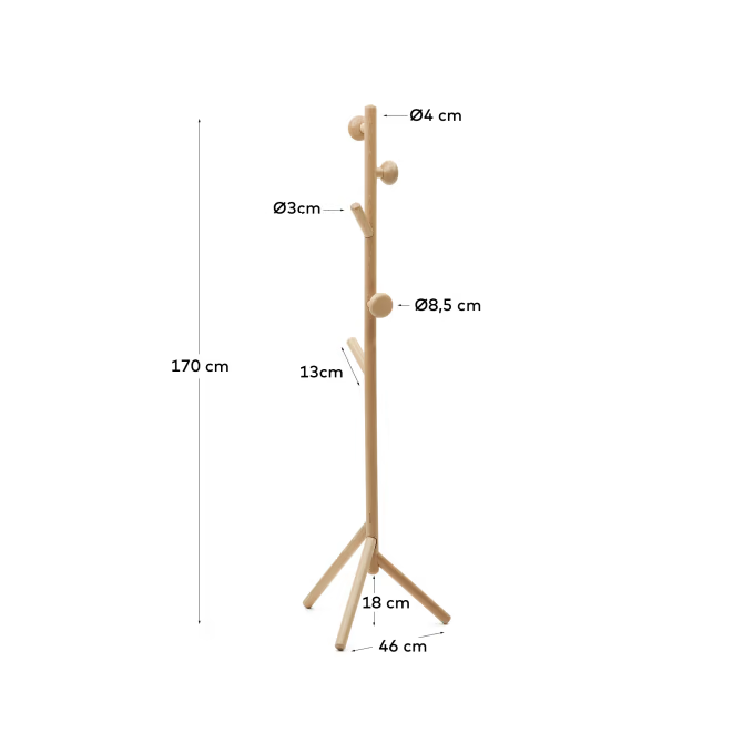 Aufhänger Nadue ist vom seriösen Kave Home -Projektteam mehr als nur ein funktionales Element - dies ist eine echte Eleganz organischer Formen im Design. Eine überraschend harmonische Kombination von fünf abnehmbaren Kleiderbügeln und drei geneigten Beinen verleiht ihm ein einzigartiges Aussehen, das sowohl attraktiv als auch funktional ist.