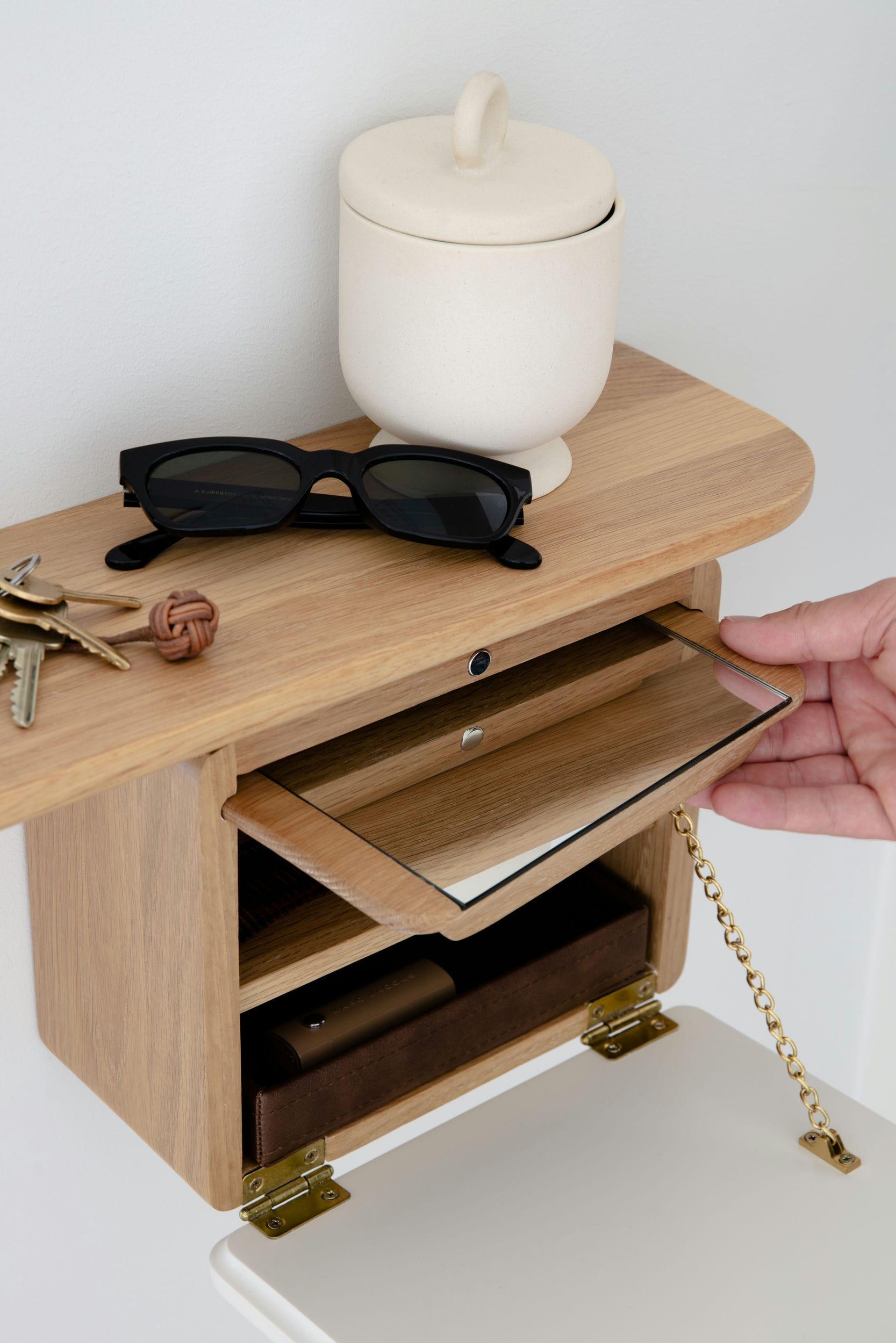 Vielen Dank an die richtige Größe Spiegel Es bietet Reflexion entlang seiner gesamten Länge, mit der Sie sich perfekt vorbereiten können, bevor Sie das Haus verlassen. Darüber hinaus ist der Spiegel mit einem Regal und einem kleinen Schrank mit praktischem Spiegel und Lederschalen ausgestattet - eine ideale Lösung für die Aufbewahrung alltäglicher Objekte wie Schlüssel, Kosmetik, Sonnenbrille und Ersatzmünzen.