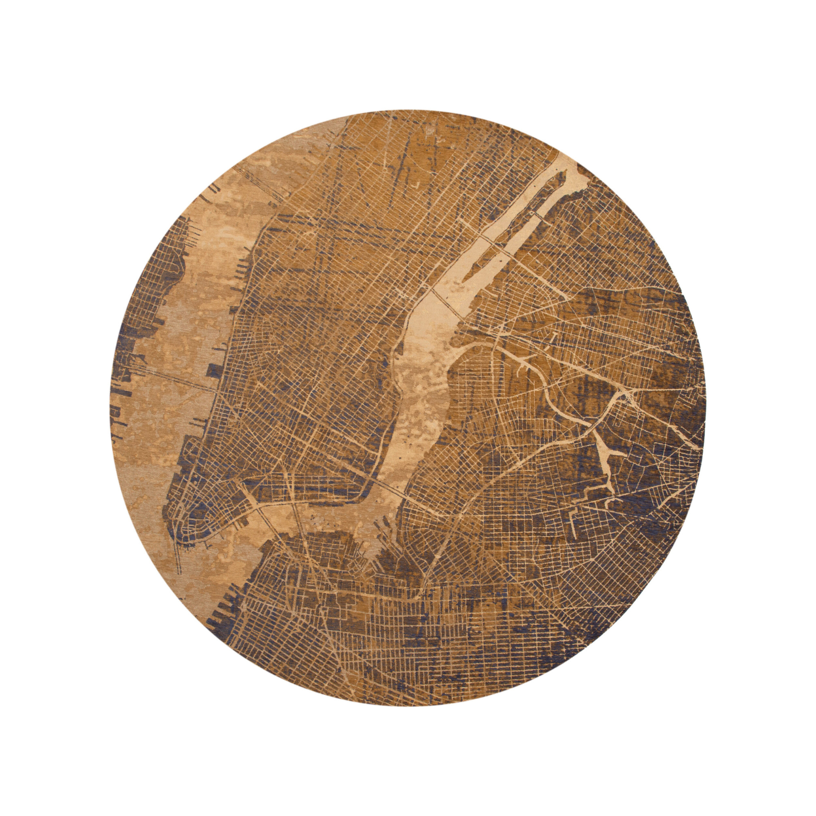 Runder brauner moderner Teppich Städte New York Gatsby Gold Round wird Sie mit seinem einzigartigen Design auf jeden Fall begeistern. Die Kollektion, die von A Bird's Sach View Views inspiriert ist, zeigt New York in einem völlig neuen Licht. Das einzigartige Muster kombiniert elegantes Brown mit goldenen Akzenten und schafft eine mysteriöse Ästhetik, die an die Atmosphäre alter Karten und Stadtarchitektur erinnert.